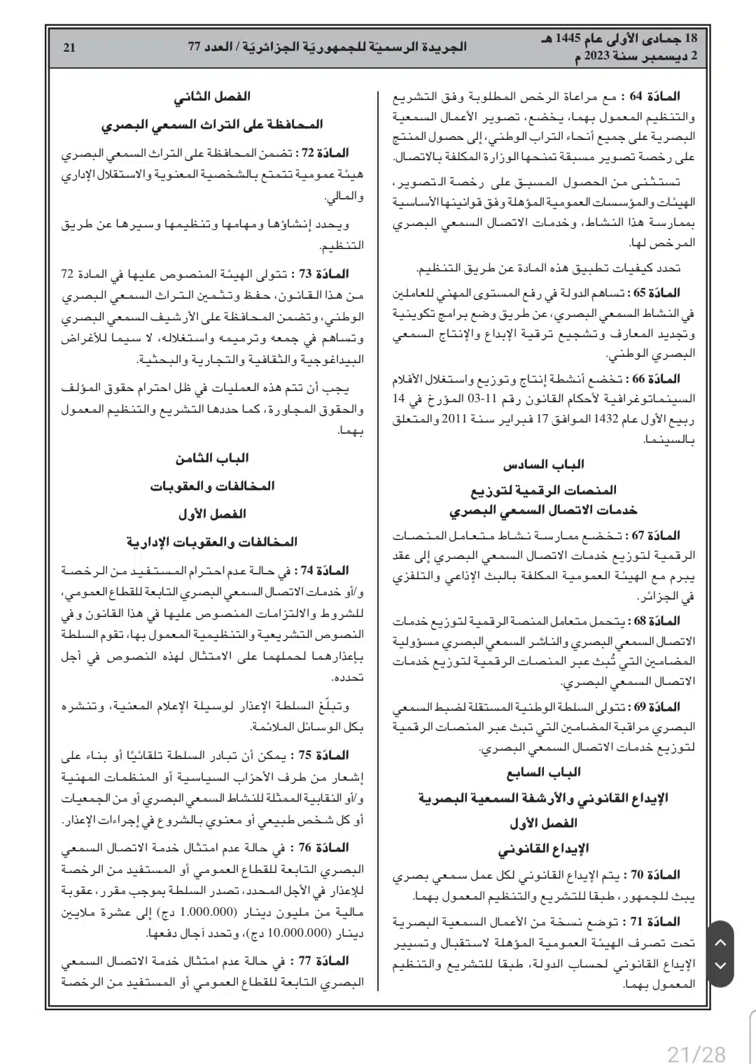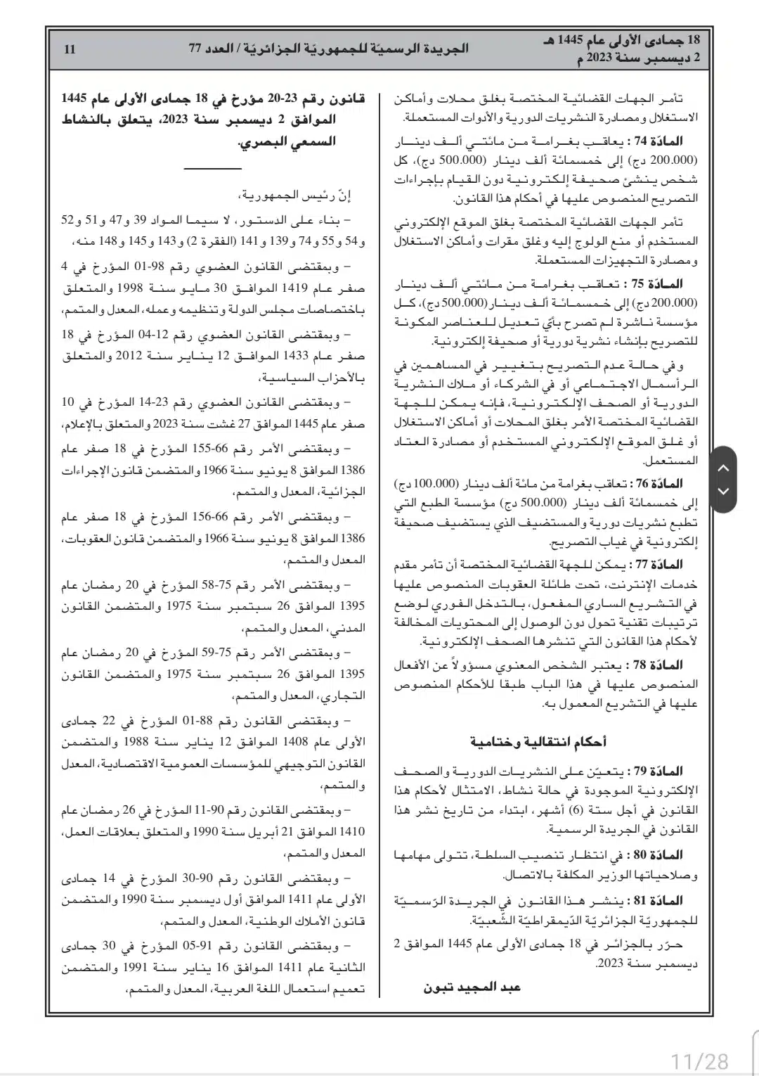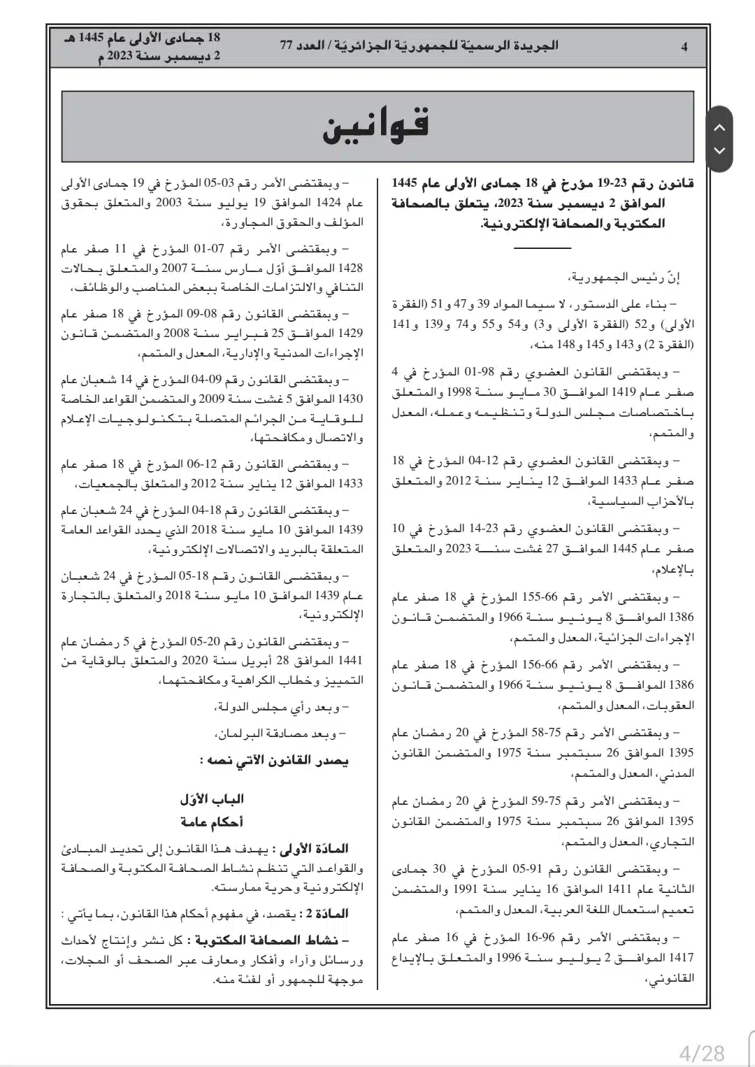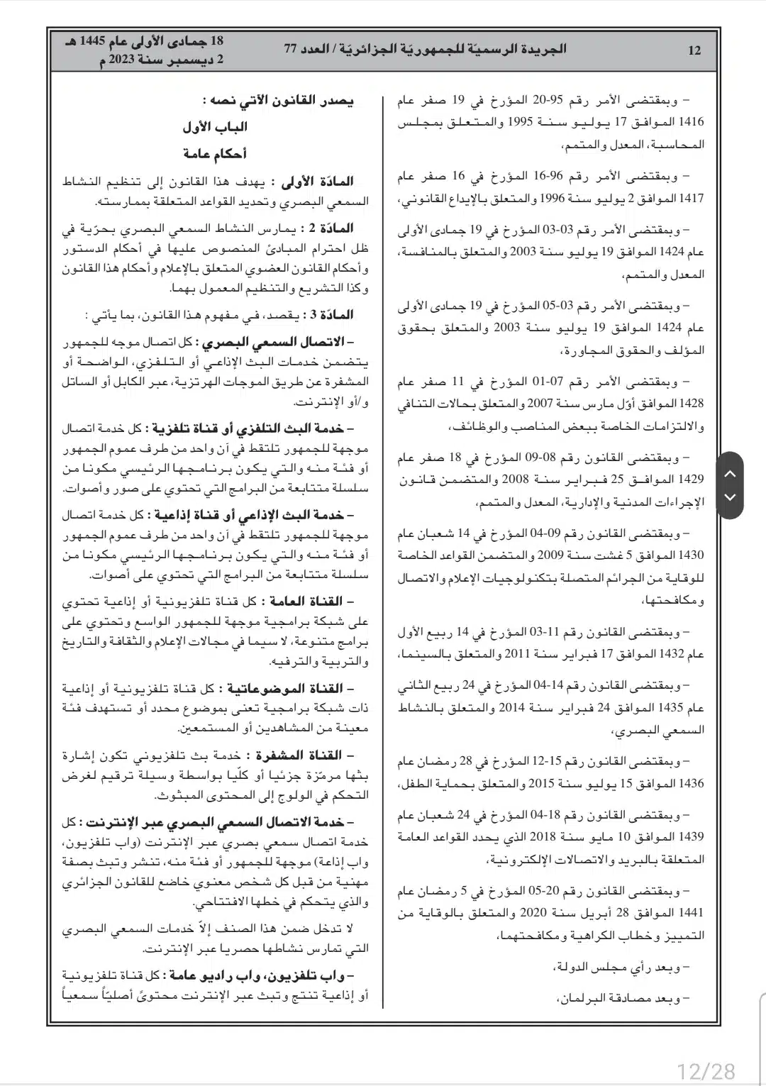 صدر أمس السبت، في العدد 77 من الجريدة الرسمية، القانون رقم 23-19 المتعلق بالصحافة المكتوبة والصحافة الإلكترونية، وكذا قانون رقم 23-20 المتعلق بالنشاط السمعي البصري.