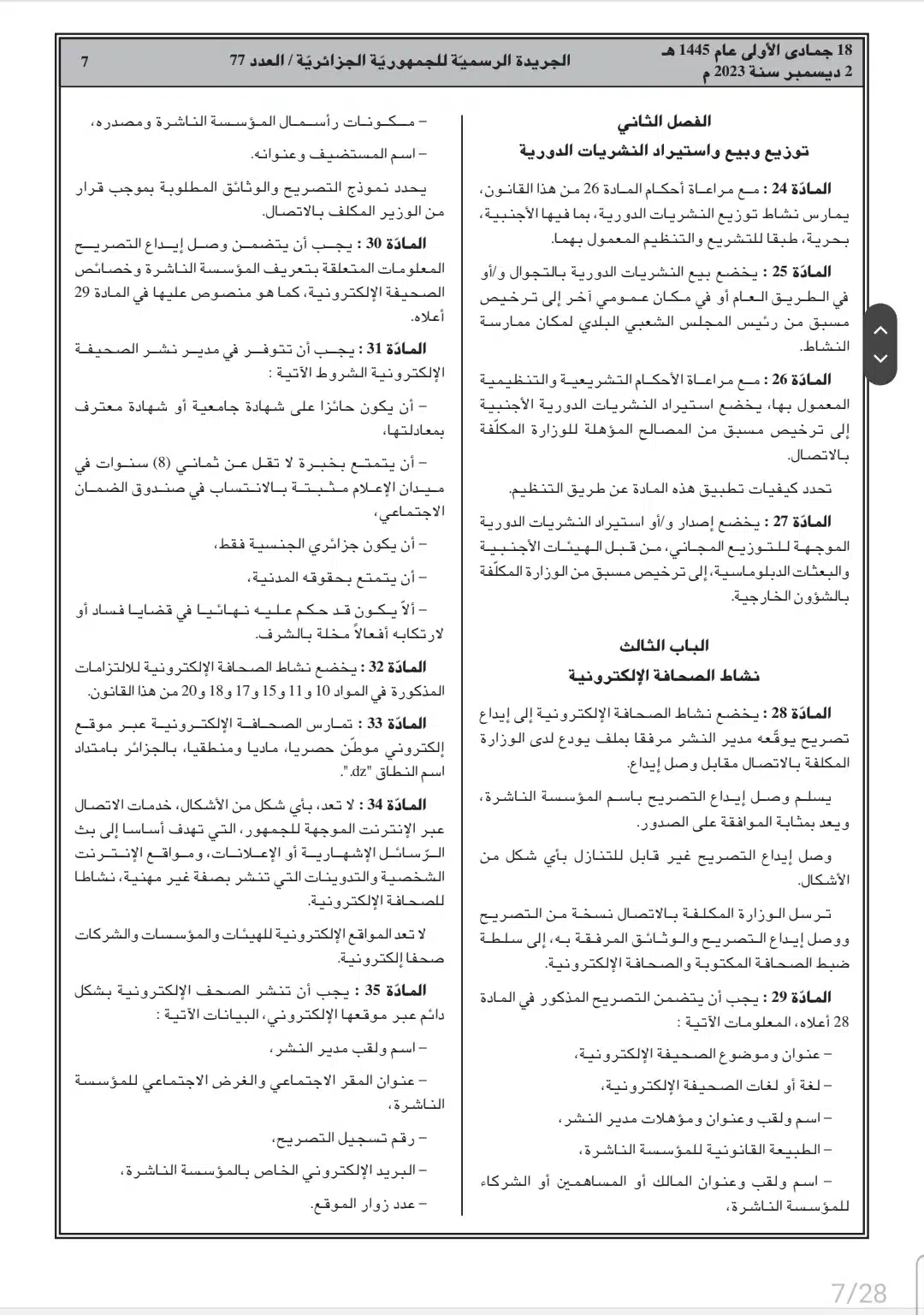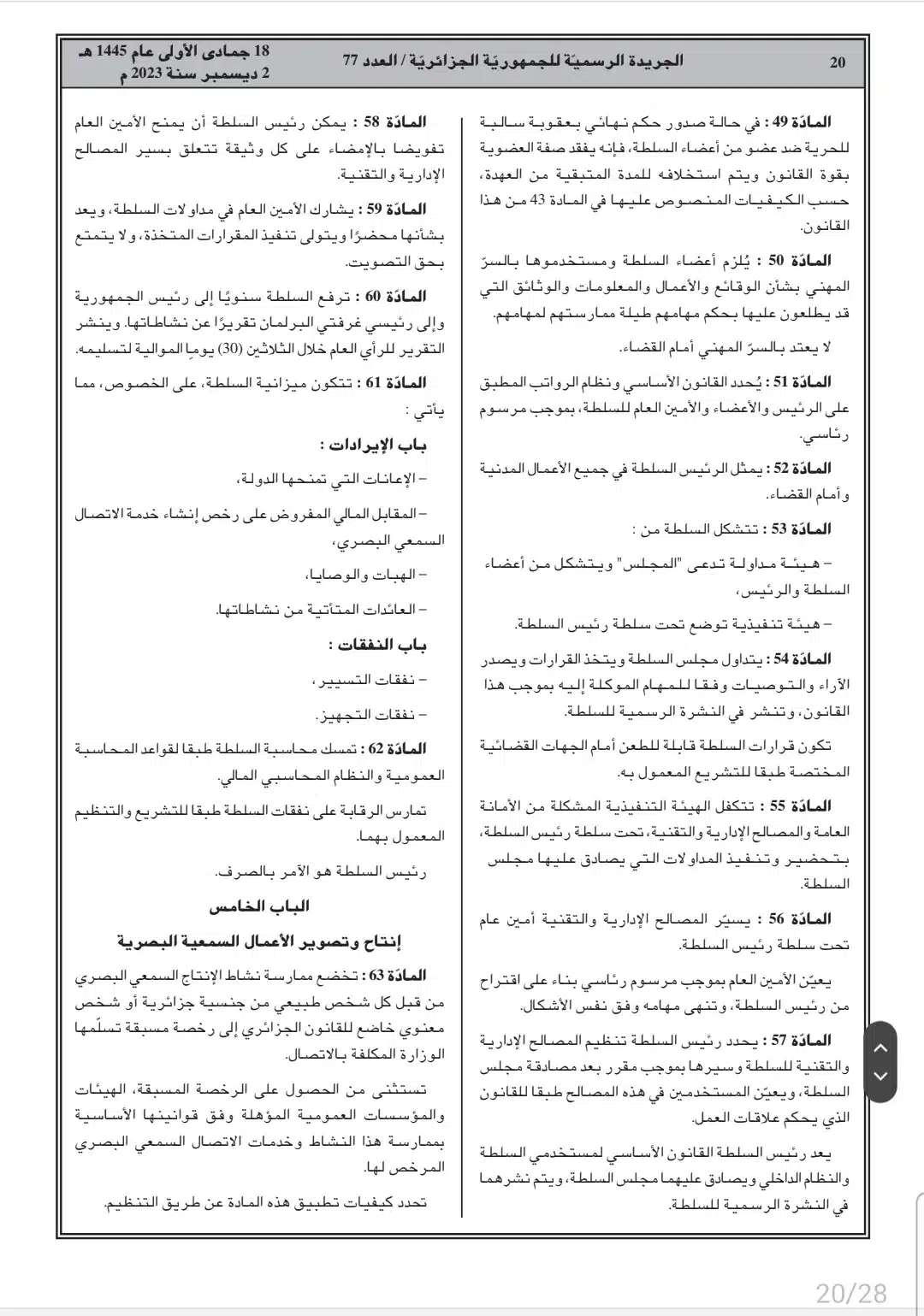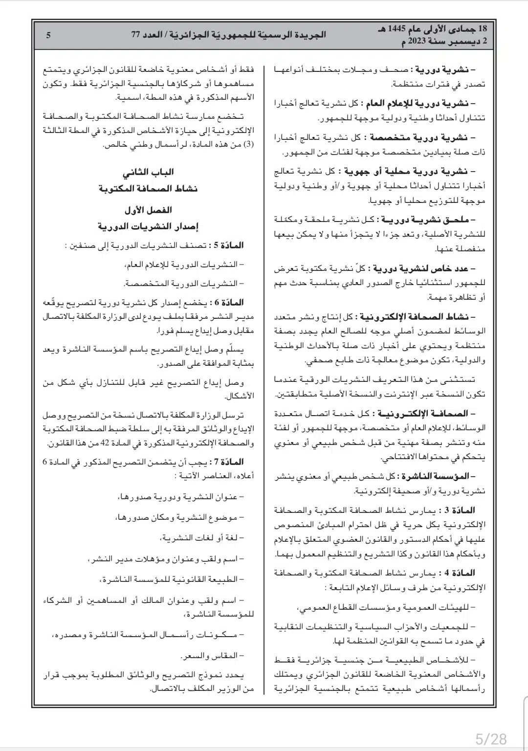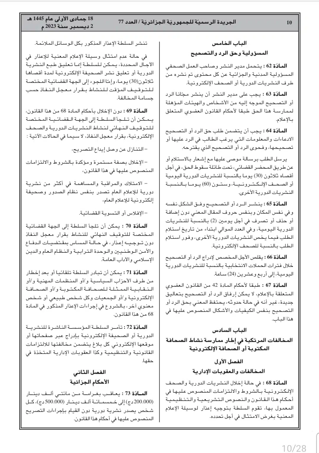 صدر أمس السبت، في العدد 77 من الجريدة الرسمية، القانون رقم 23-19 المتعلق بالصحافة المكتوبة والصحافة الإلكترونية، وكذا قانون رقم 23-20 المتعلق بالنشاط السمعي البصري.