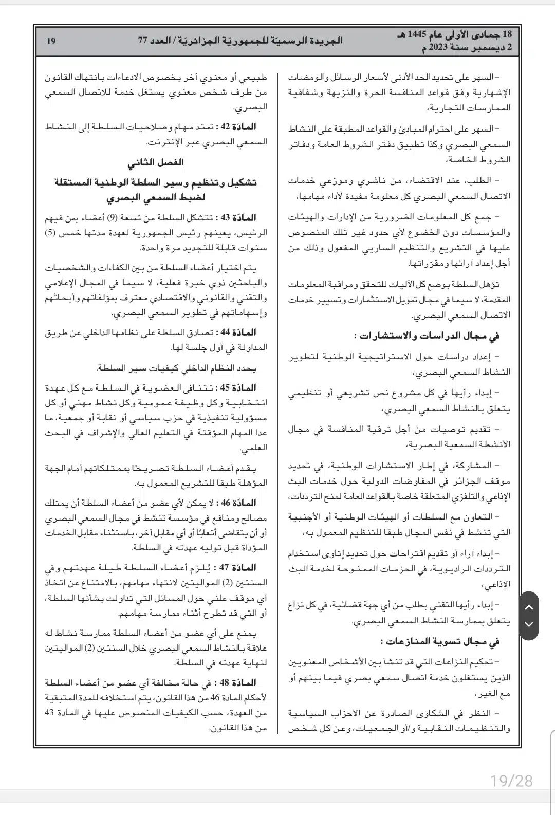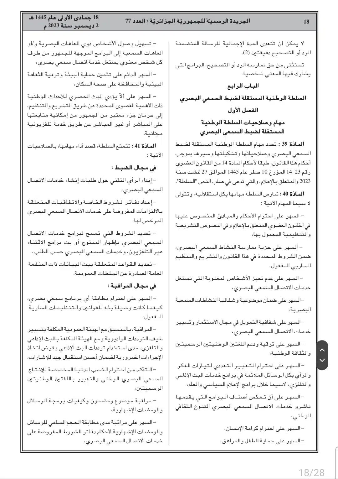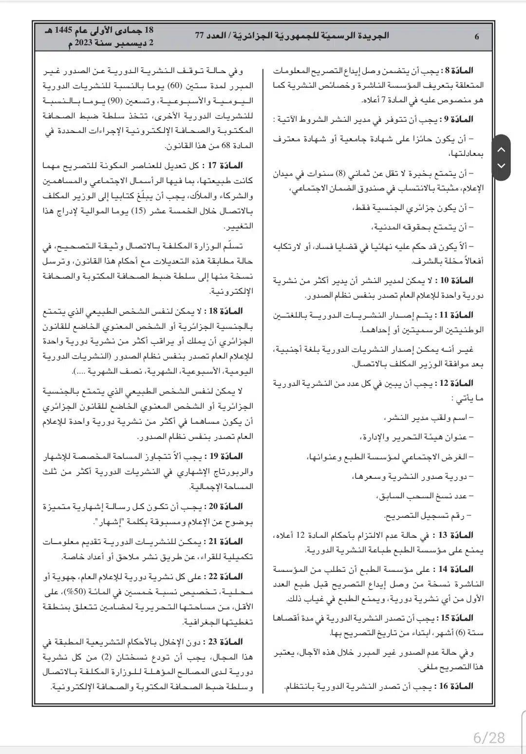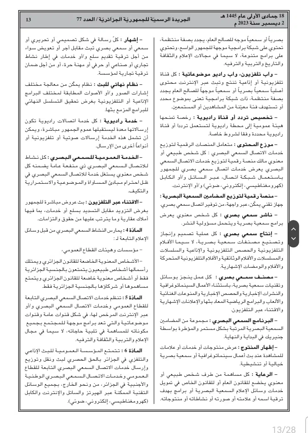 صدر أمس السبت، في العدد 77 من الجريدة الرسمية، القانون رقم 23-19 المتعلق بالصحافة المكتوبة والصحافة الإلكترونية، وكذا قانون رقم 23-20 المتعلق بالنشاط السمعي البصري.