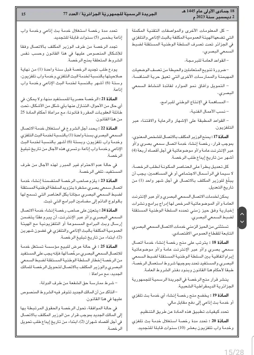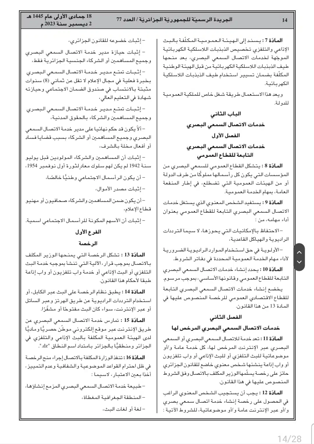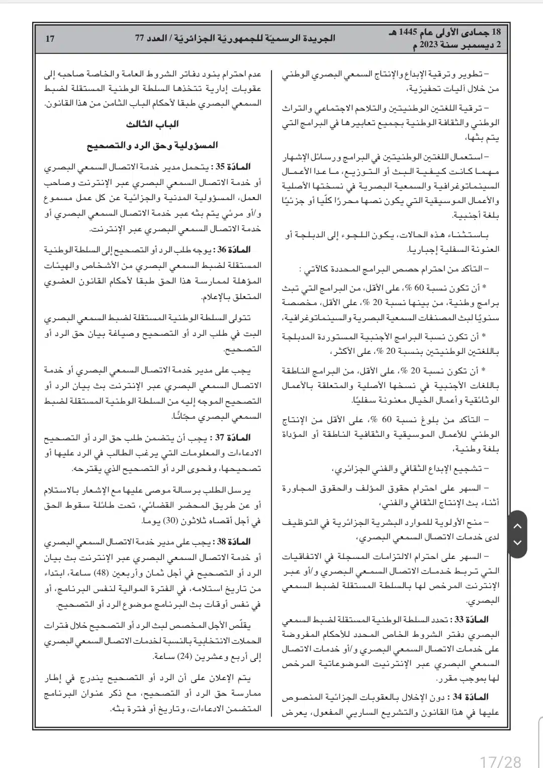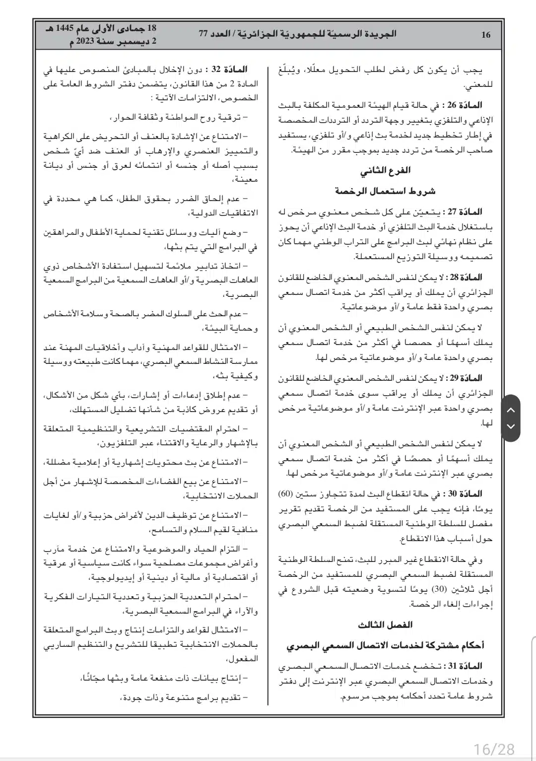 صدر أمس السبت، في العدد 77 من الجريدة الرسمية، القانون رقم 23-19 المتعلق بالصحافة المكتوبة والصحافة الإلكترونية، وكذا قانون رقم 23-20 المتعلق بالنشاط السمعي البصري.