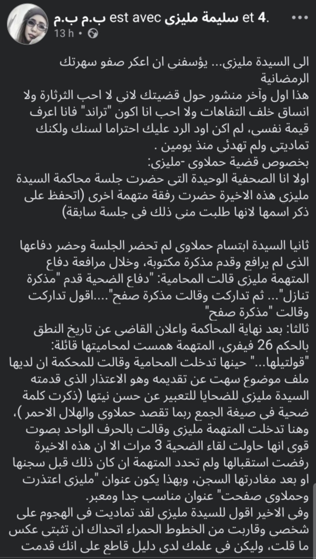 وفي ختام منشورها، قالت الصحفية إن مليزي تمادت في الهجوم على شخصها وقاربت من الخطوط الحمراء، متحدية إياها أن تثبت عكس ما ذكرته، ومؤكدة أنها تملك دليلا قاطعا على تقديم رسالة اعتذار للضحية ابتسام حملاوي، لكنها لا تريد نشره حفاظا على مصدرها وحتى لا ينصدم جمهورها في هذا الشهر الفضيل.