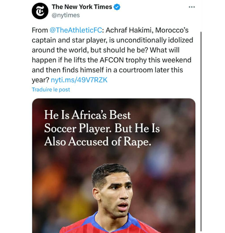 صحيفة the new york times سلطت الضوء على القضية في تقرير نشرته يوم أمس مؤكدة بأن أشرف حكيمي سيواجه محاكمة حول الموضوع خلال سنة 2026 , الأمر الذي قد يجعله يدخل السجن مثلما حدث مع لاعبين آخرين في كرة القدم أمثال رونالدينهو روبينهو و داني ألفيس.