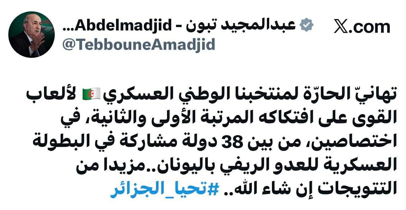 و قال الرئيس تبون في منشور عبر صفحته الرسمية على موقع التواصل الاجتماعي فايسبوك : تهانيّ الحارّة لمنتخبنا الوطني العسكري لألعاب القوى على افتكاكه المرتبة الأولى والثانية، في اختصاصين، من بين 38 دولة مشاركة في البطولة العسكرية للعدو الريفي باليونان ، مزيدا من التتويجات إن شاء الله.