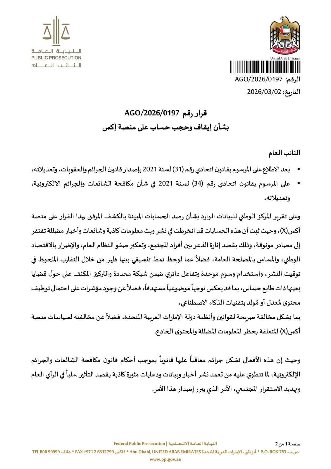 ولوحت الوثيقة بقانون الجرائم الإلكترونية في الإمارات وضرورة عدم نشر أو إعادة نشر أي محتوى من شأنه “التأثير على الأمن أو الاقتصاد الوطني” ومهدة باتخاذ الإجراءات القانونية اللازمة.