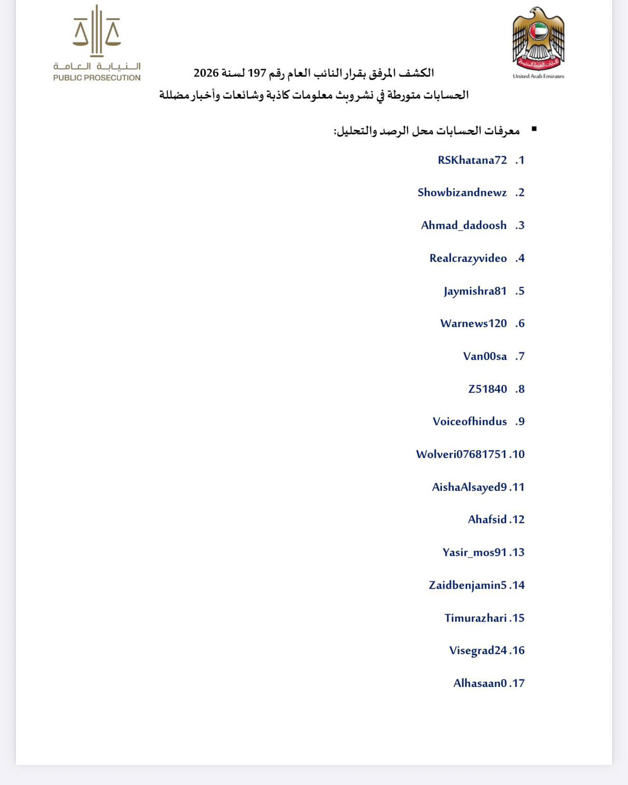 ونشرت وثيقة رسمية صادرة عن النيابة العامة الإماراتية تتهم 35 حسابا على الأقل بنشر محتوى يتضمن معلومات أو تصريحات من شأنها الإضرار بالمصلحة العامة والإخلال بالنظام العام داخل الدولة.