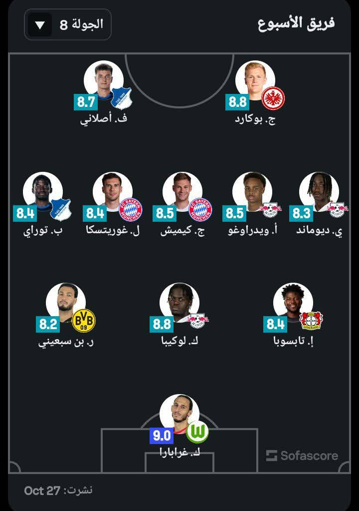 و اليكم التشكيلة المثالية للجولة الثامنة من الدوري الالماني :