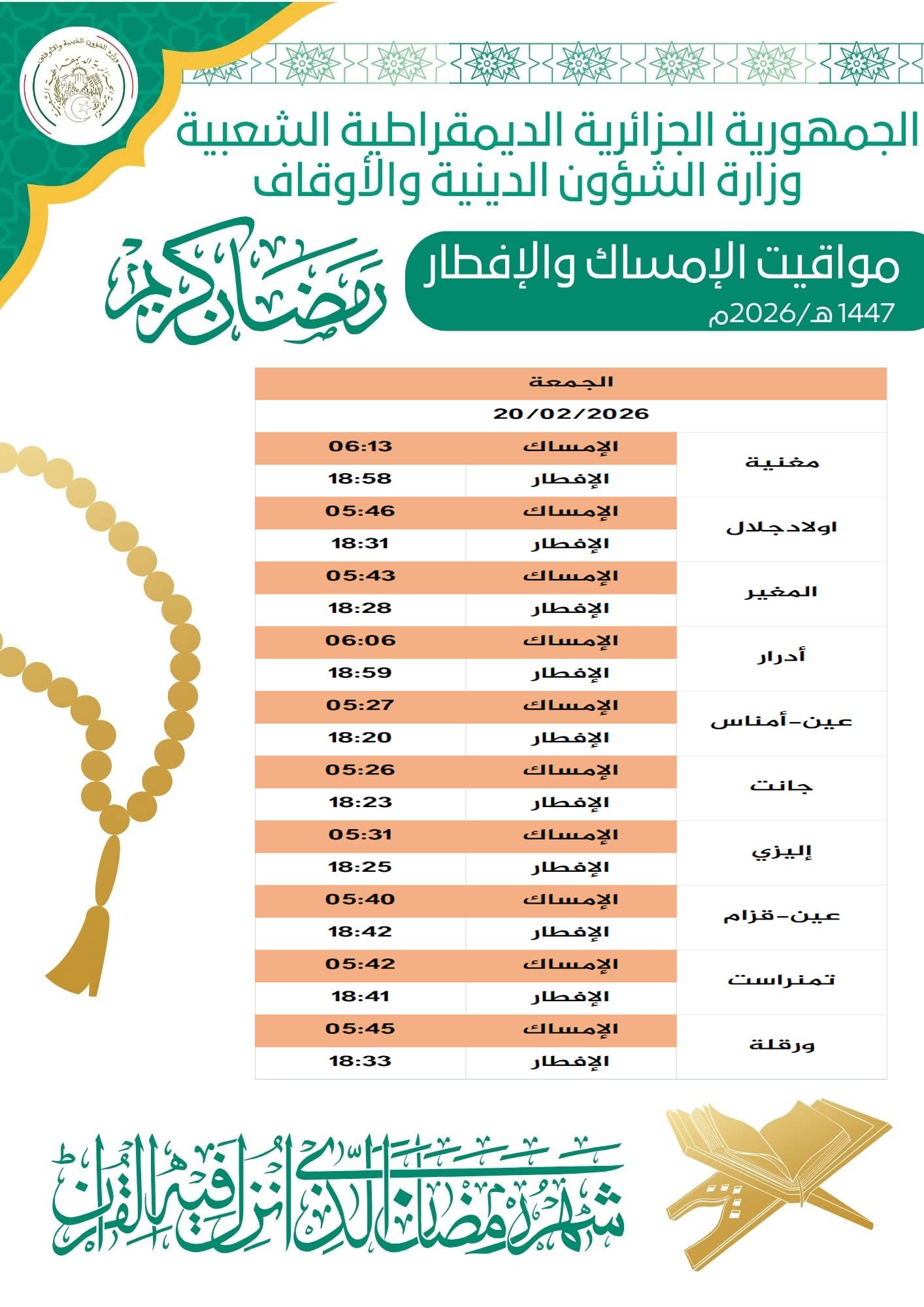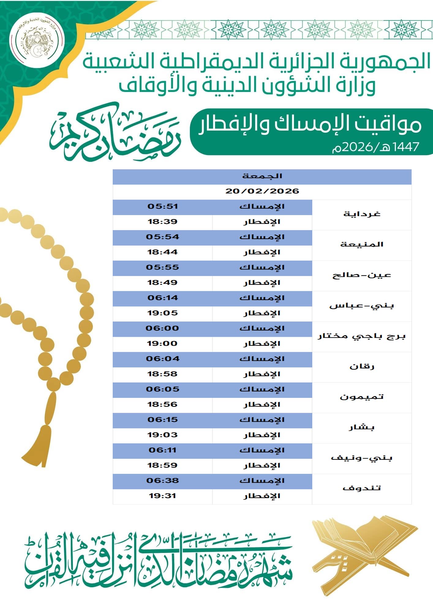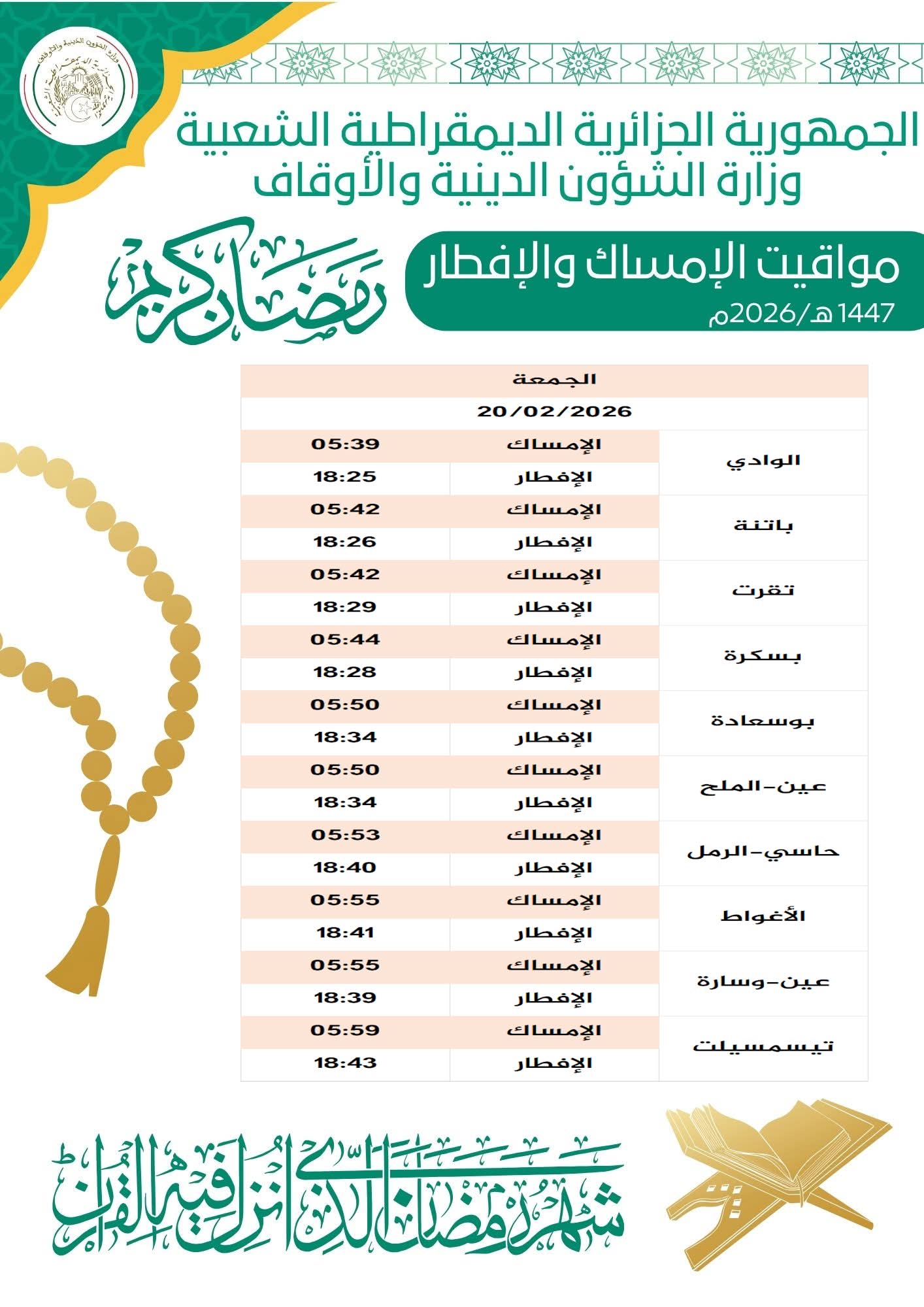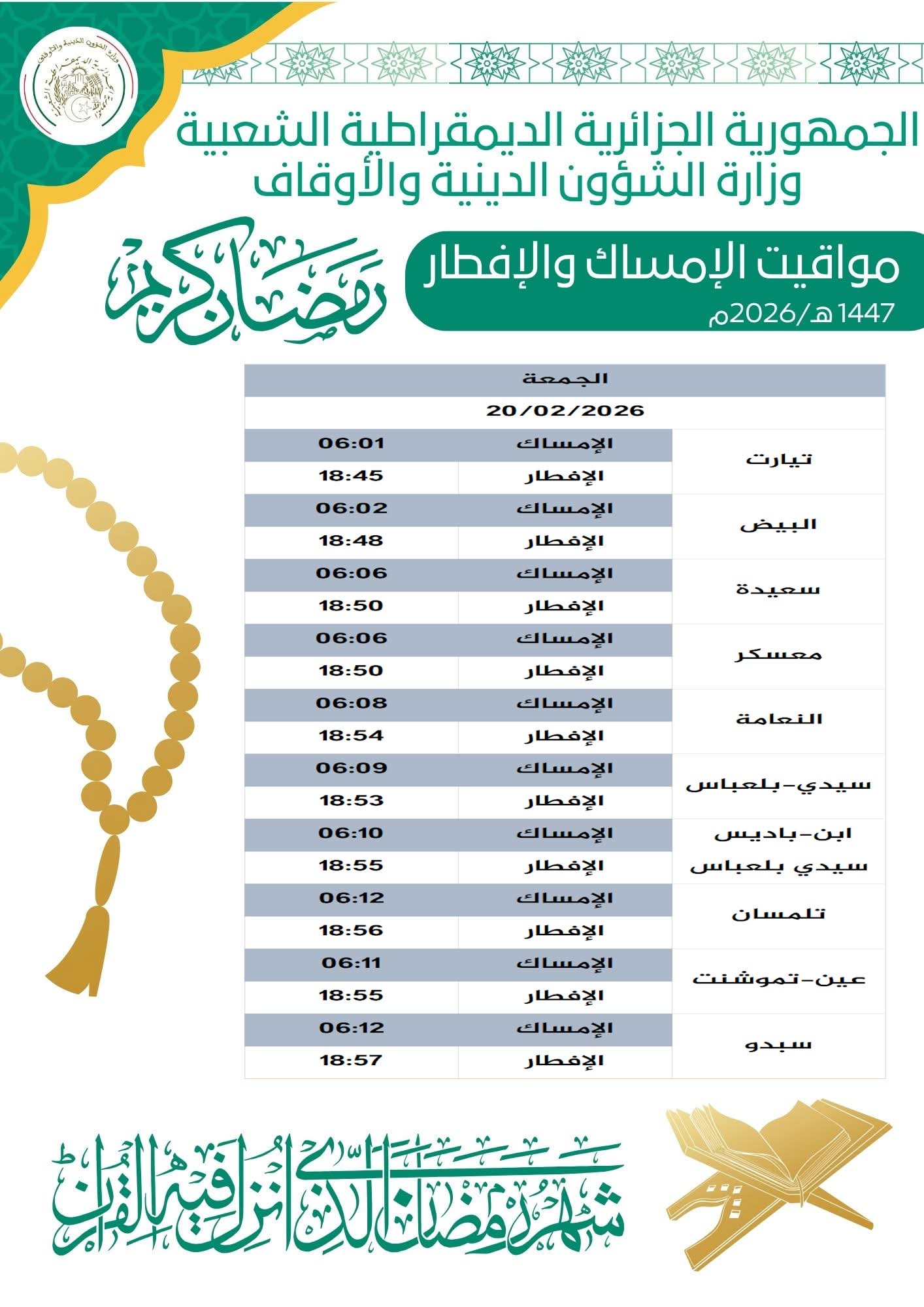 وفيما يلي مواقيت الإمساك والإفطار ليوم 02 رمضان 1447هـ / 20 فيفري 2026:
