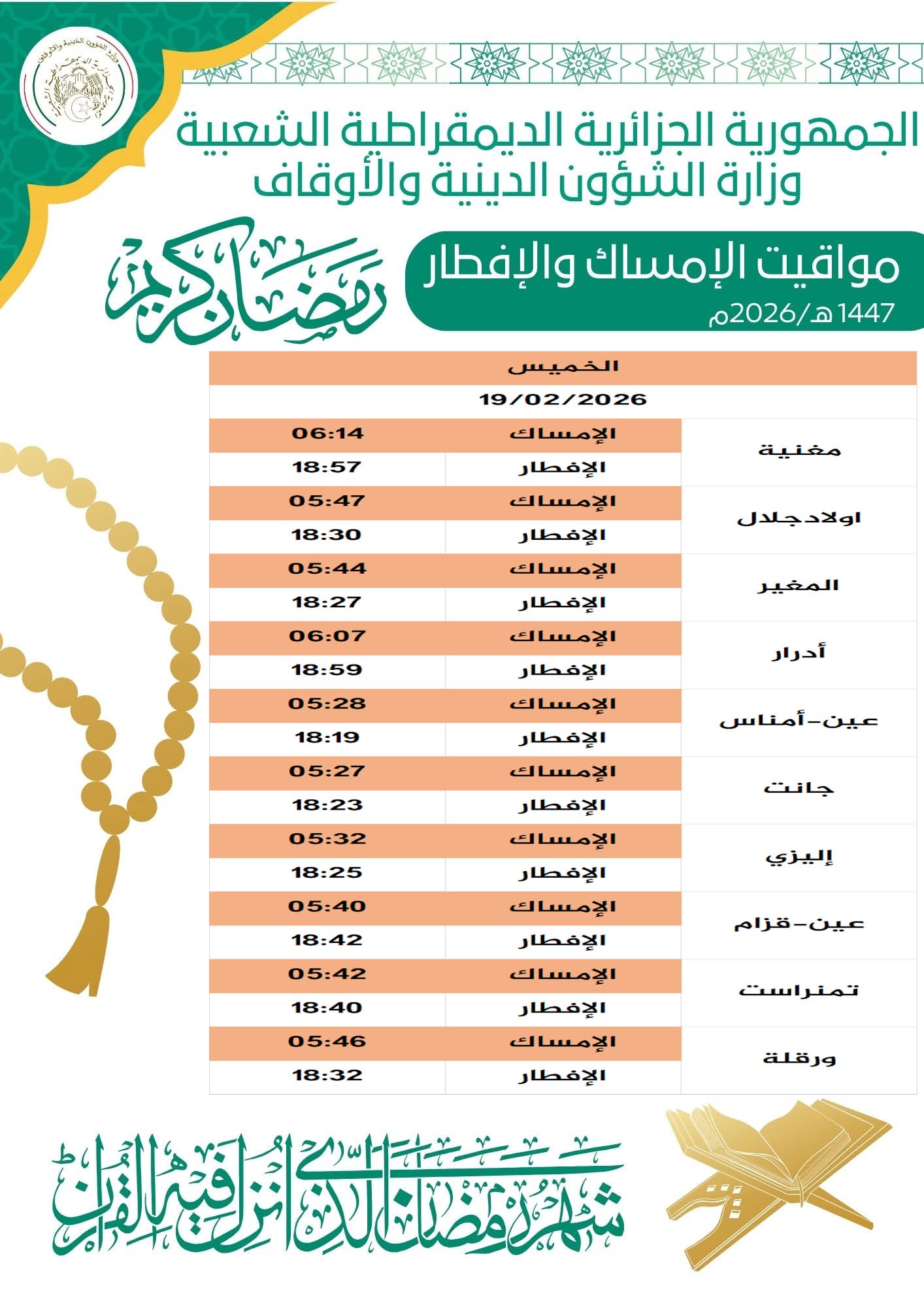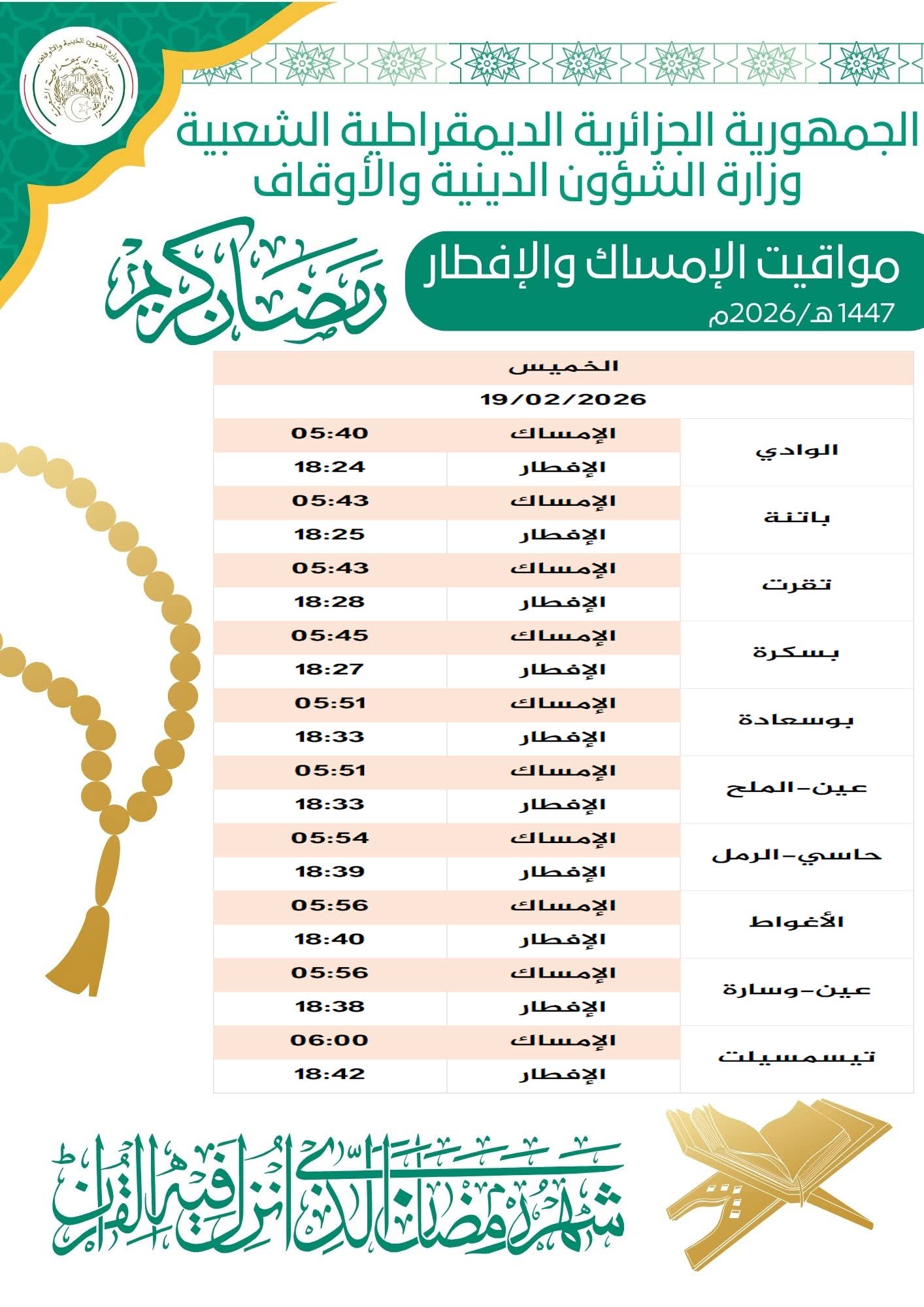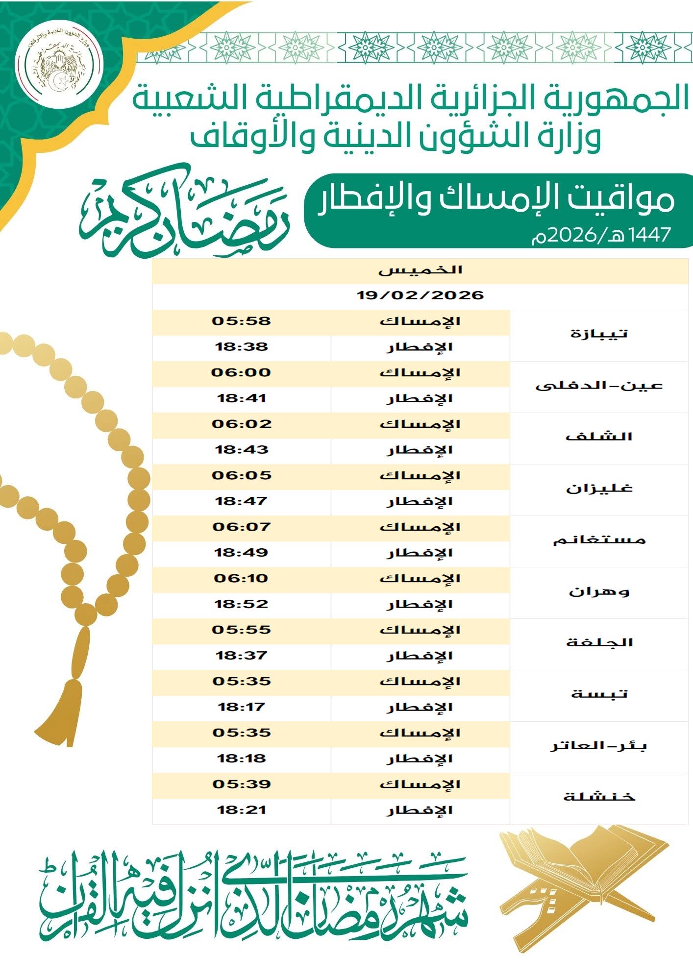 وفيما يلي مواقيت الإمساك والإفطار ليوم 01 رمضان 1447هـ / 19 فيفري 2026: