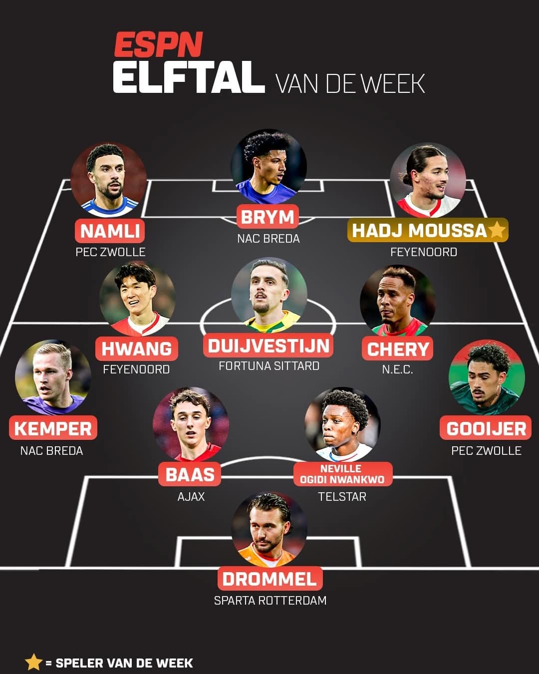 و اختير الجزائري أنيس حاج موسى نجما للجولة ال20 بعد المستويات الكبيرة التي ظهر بها رفقة فريقه فاينورد أمام نادي هيراكلوس .