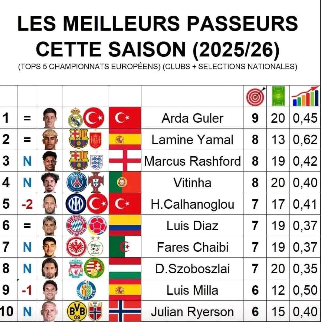 و يتصدر التركي و نجم نادي ريال مدريد الاسباني أردا غولر ترتيب أفضل الممررين الحاسمين في الدوريات الخمس الكبرى ب 9 تمريرات حاسمة.