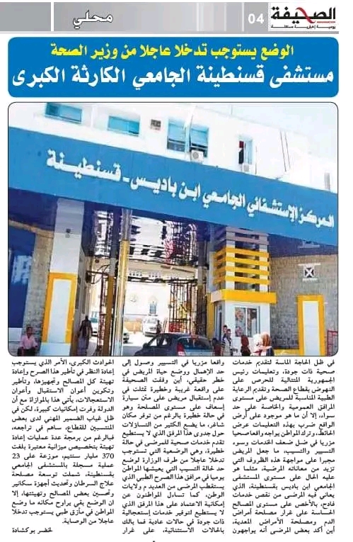 وحسب ما نقلته جريدة الصحيفة، فإن المستشفى الجامعي ابن باديس بقسنطينة يشهد وضعية صعبة من حيث تقديم الخدمات الصحية، خاصة على مستوى بعض المصالح الحساسة على غرار مصلحة أمراض الدم ومصلحة الأمراض المعدية، حيث اشتكى مرضى من نقص واضح في الخدمات وسوء في التسيير، ما يزيد من معاناتهم داخل هذا المرفق الاستشفائي.