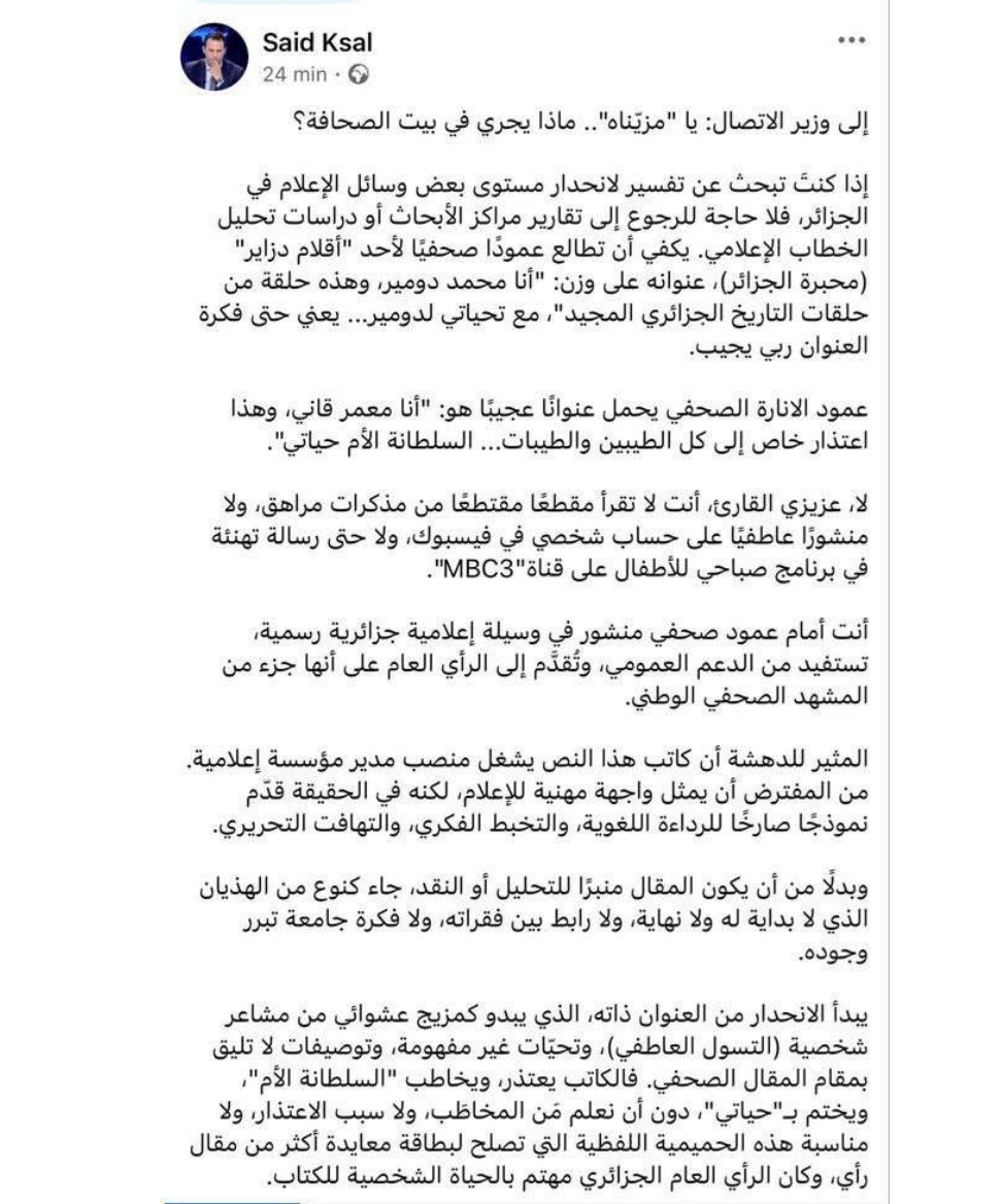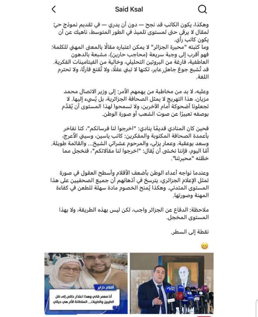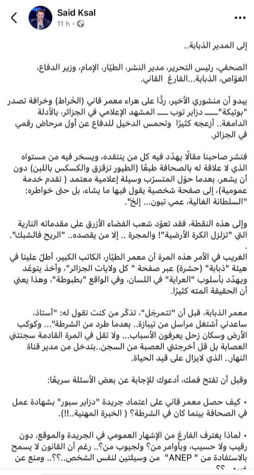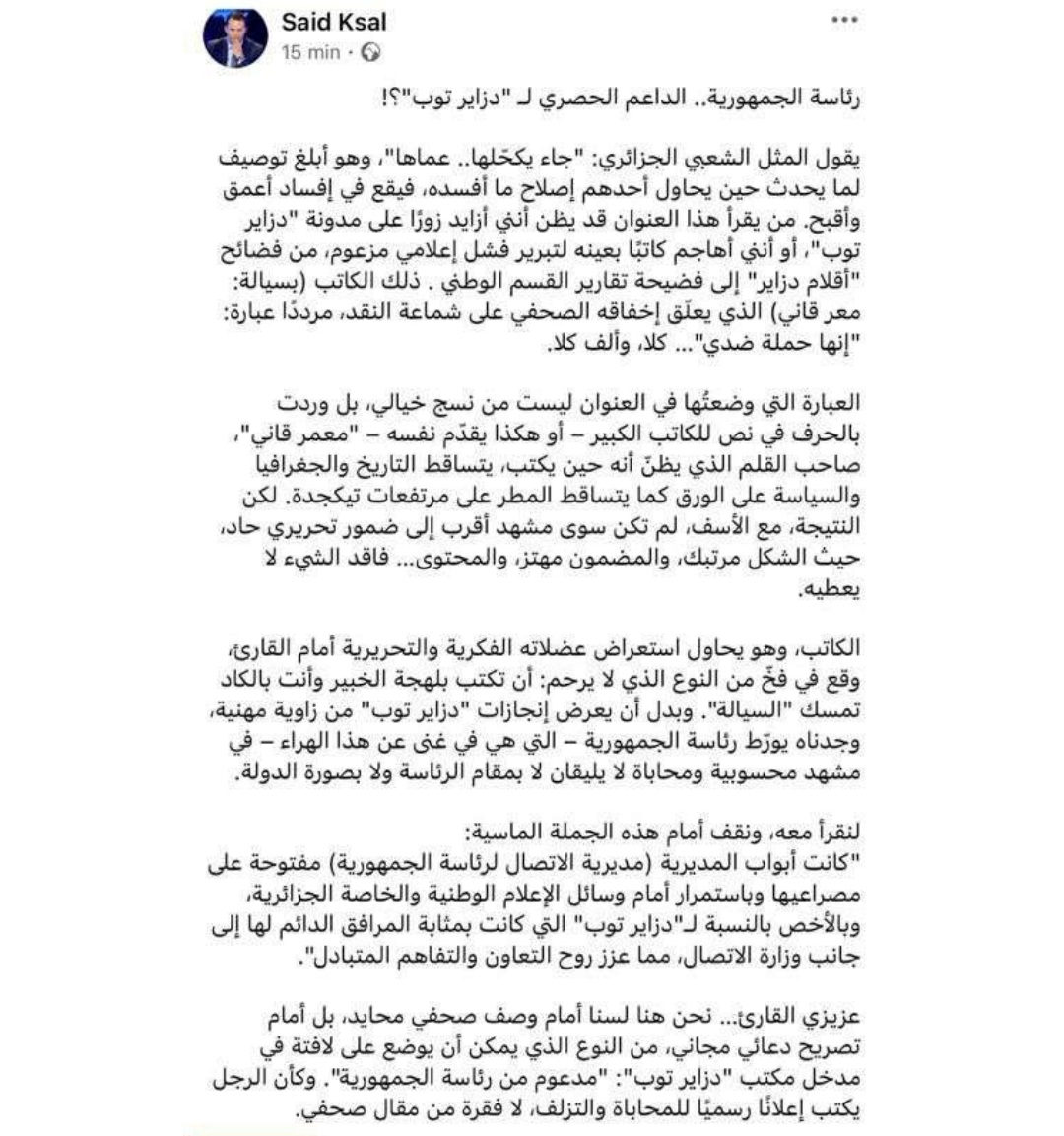 كما شدّد السيد قاني، على أن المدعو سعيد كسال تجاوز كل حدود الاحترام وأخلاقيات المهنة، بنشره منشورات مليئة بالإهانة والسبّ والتشهير، وصلت إلى حد التشبيه المهين لمؤسسة “دزاير توب” بـ”مرحاض رقمي”، وهي عبارات لا تمتّ بأي صلة للنقد المهني أو حرية التعبير، بل تمثل اعتداءً لفظيًا صريحًا وخرقًا فاضحًا للقانون.