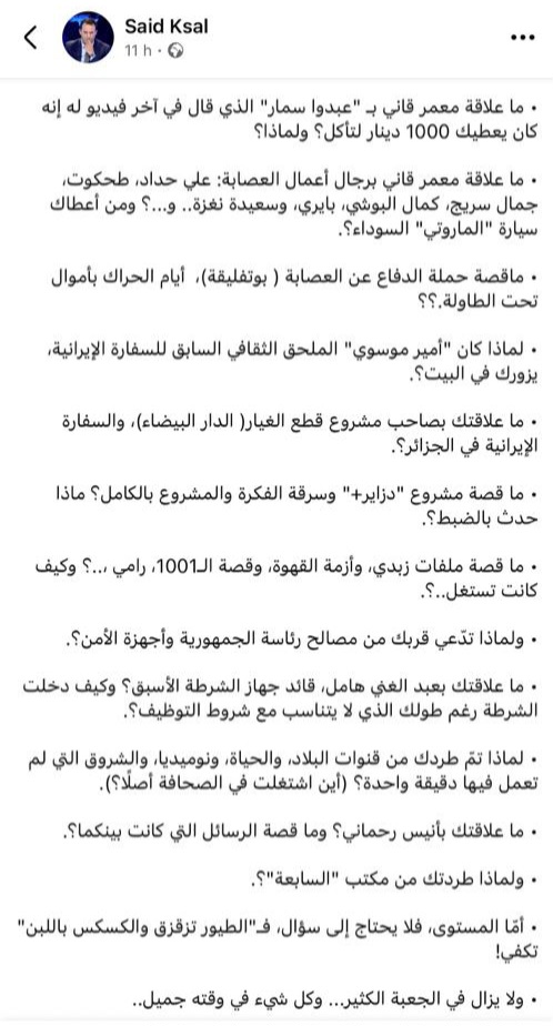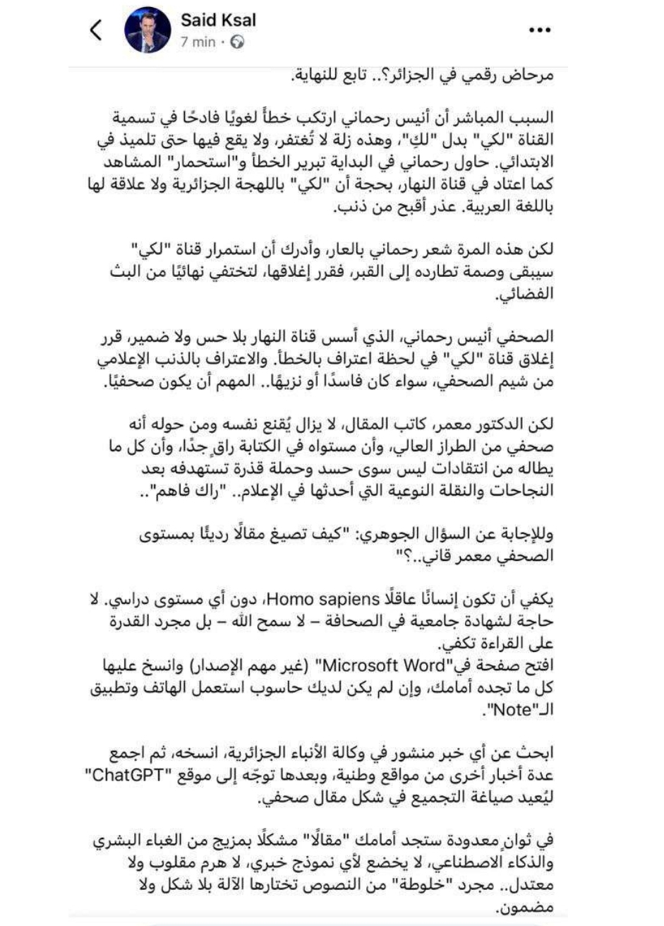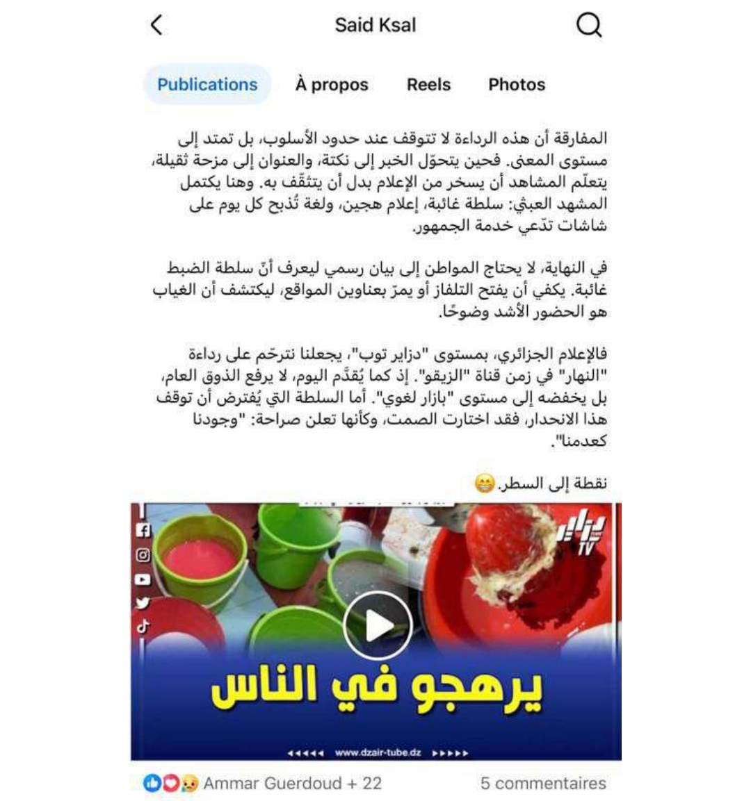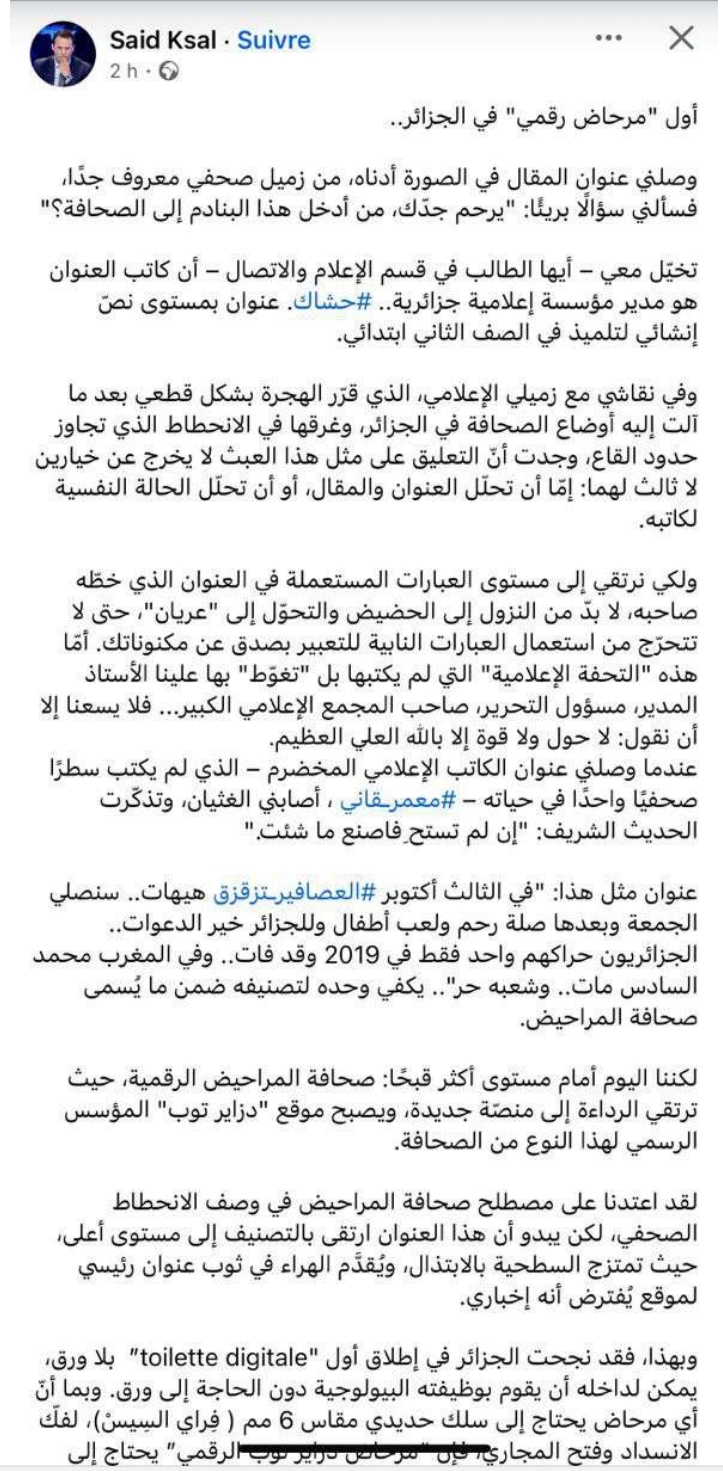 كما شدّد السيد قاني، على أن المدعو سعيد كسال تجاوز كل حدود الاحترام وأخلاقيات المهنة، بنشره منشورات مليئة بالإهانة والسبّ والتشهير، وصلت إلى حد التشبيه المهين لمؤسسة “دزاير توب” بـ”مرحاض رقمي”، وهي عبارات لا تمتّ بأي صلة للنقد المهني أو حرية التعبير، بل تمثل اعتداءً لفظيًا صريحًا وخرقًا فاضحًا للقانون.