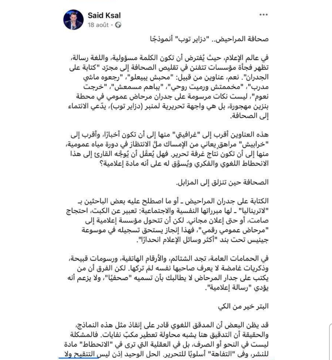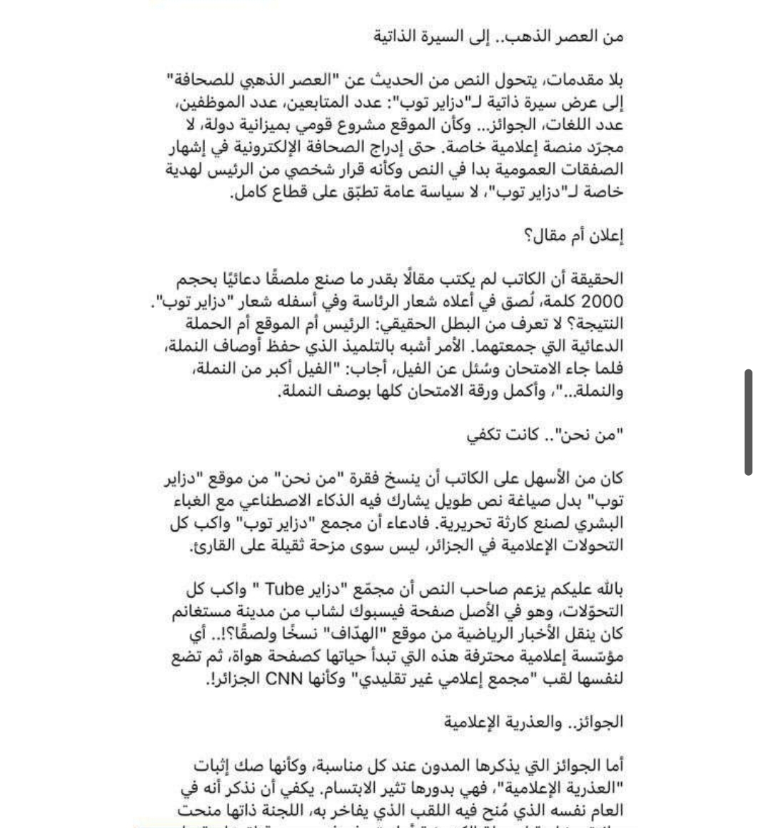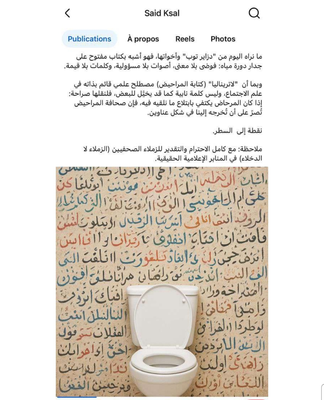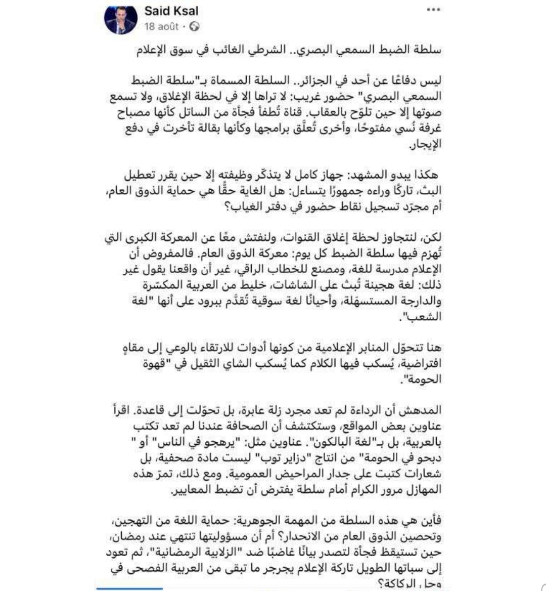 كما شدّد السيد قاني، على أن المدعو سعيد كسال تجاوز كل حدود الاحترام وأخلاقيات المهنة، بنشره منشورات مليئة بالإهانة والسبّ والتشهير، وصلت إلى حد التشبيه المهين لمؤسسة “دزاير توب” بـ”مرحاض رقمي”، وهي عبارات لا تمتّ بأي صلة للنقد المهني أو حرية التعبير، بل تمثل اعتداءً لفظيًا صريحًا وخرقًا فاضحًا للقانون.