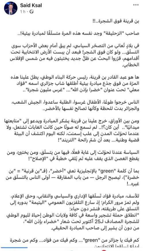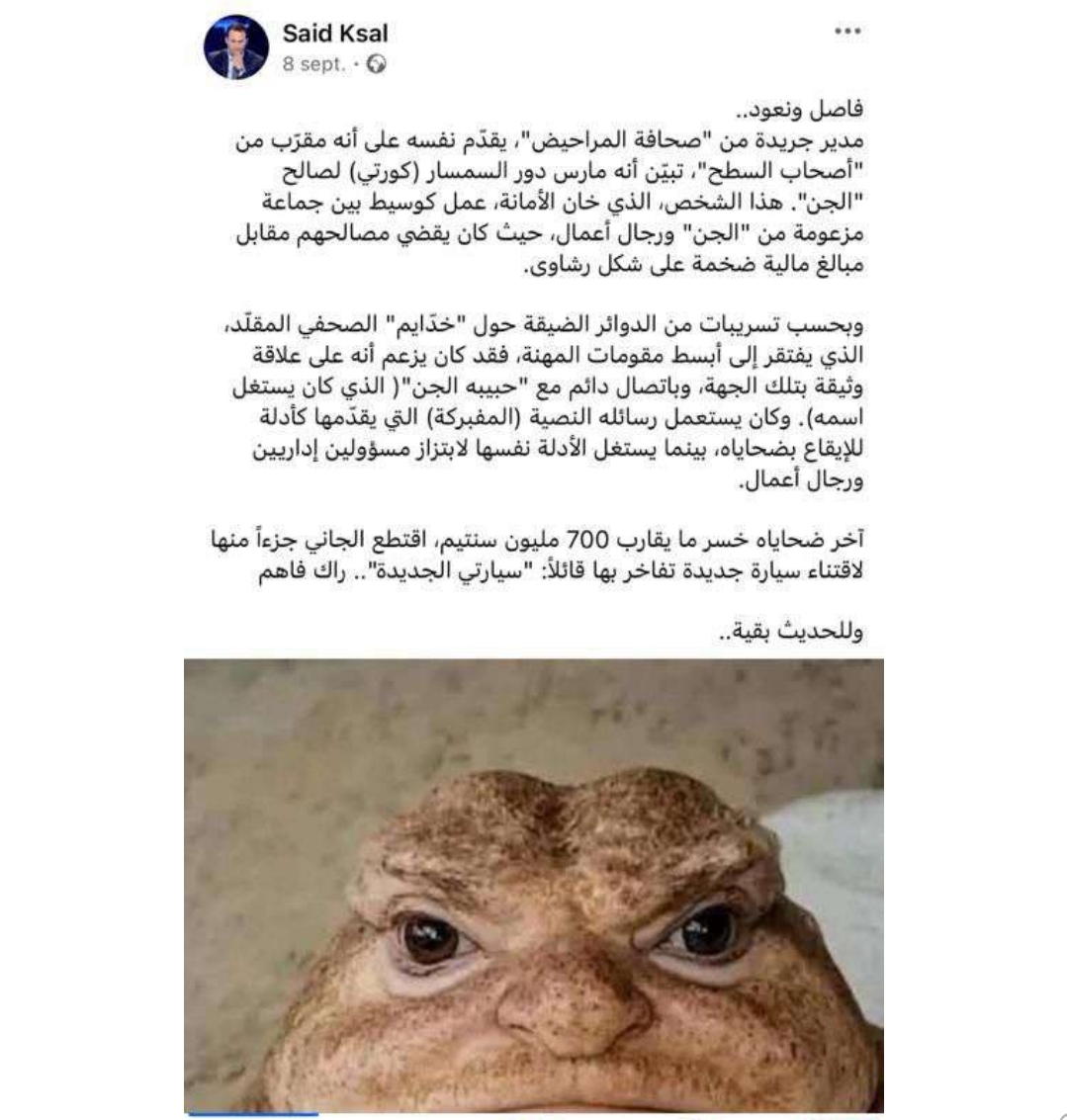 وأشار السيد قاني إلى أن المدعو سعيد كسال يستخدم صفحته على الفيسبوك كمنصة للتهجم المتكرر بغرض الإساءة إلى شخصيات وطنية وإعلامية، في تجاوز واضح لكل القيم والأعراف المهنية، مؤكدًا أن الصور المرفقة التي تمثل لقطات شاشة من حسابه الرسمي على “فيسبوك” تُظهر بوضوح طبيعة العبارات المهينة والتحريضية التي ينشرها ضدّه وضدّ مؤسسته الإعلامية وأيضاً تلك الشخصيات الوطنية والإعلامية.