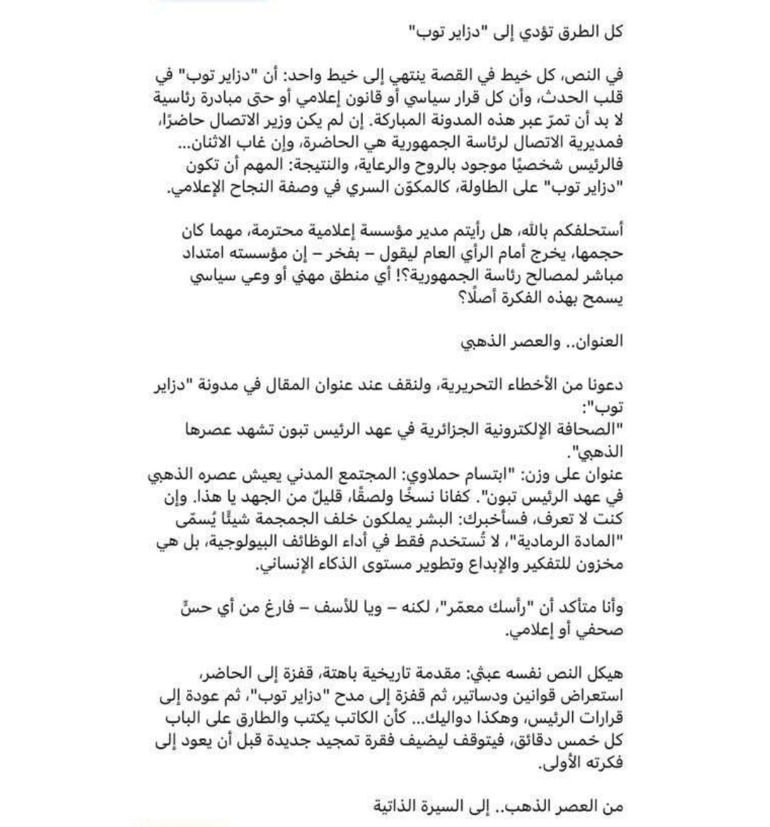 كما شدد على أن “دزاير توب” ستبقى وفية لنهجها الوطني والإعلامي الهادف، دفاعًا عن الجزائر ومؤسساتها، ومواصلة رسالتها الإعلامية الرائدة التي جعلتها في طليعة المواقع الإلكترونية الجزائرية الرصينة والملتزمة.