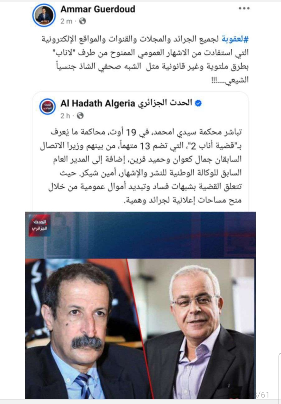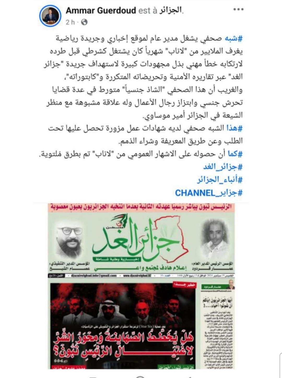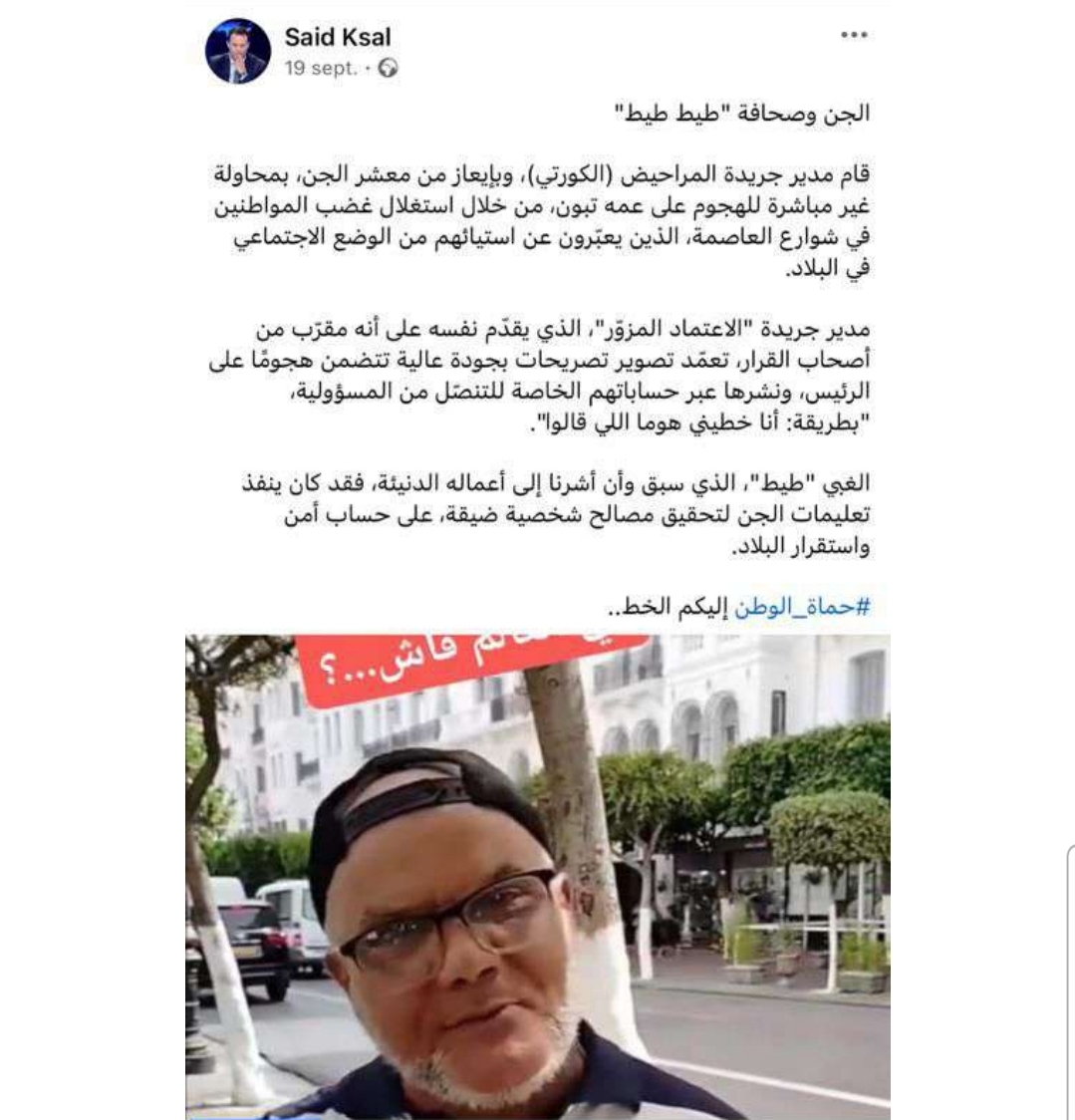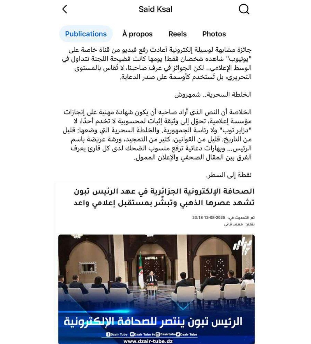 رفع مجمّع “دزاير توب” الإعلامي دعوى قضائية ضدّ كلّ من المدعو سعيد كسال المقيم حاليًا خارج الوطن، والمدعو عمار قردود، بعد سلسلة من الاعتداءات اللفظية والتشهير المتكرر الذي تجاوز كلّ حدود أخلاقيات المهنة وضوابطها.