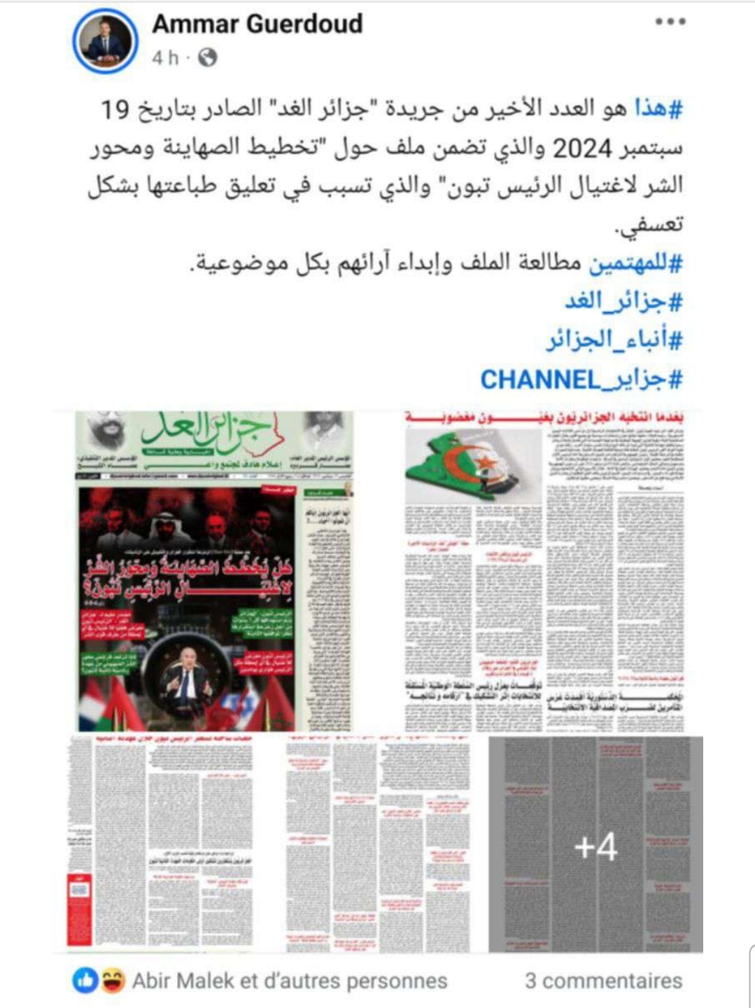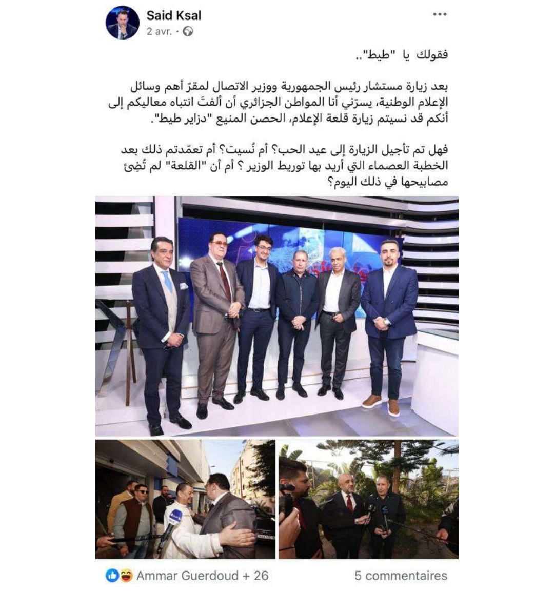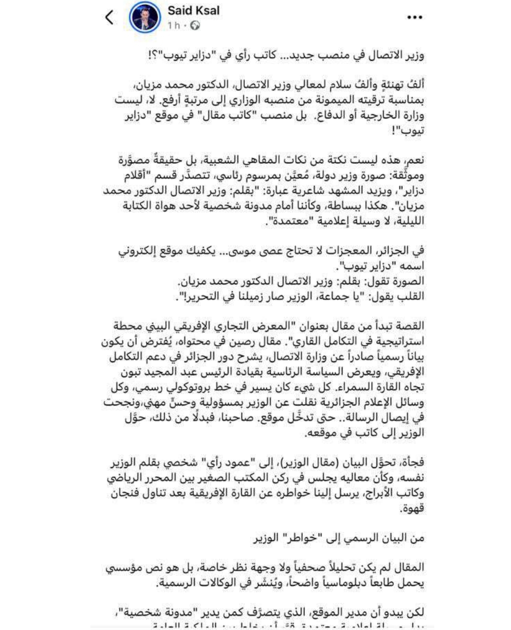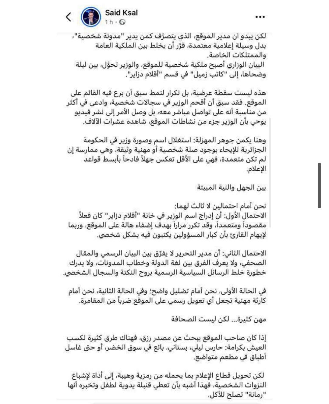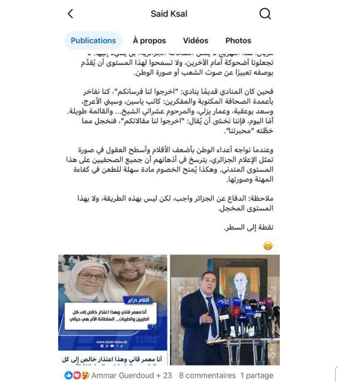كما شدّد السيد قاني، على أن المدعو سعيد كسال تجاوز كل حدود الاحترام وأخلاقيات المهنة، بنشره منشورات مليئة بالإهانة والسبّ والتشهير، وصلت إلى حد التشبيه المهين لمؤسسة “دزاير توب” بـ”مرحاض رقمي”، وهي عبارات لا تمتّ بأي صلة للنقد المهني أو حرية التعبير، بل تمثل اعتداءً لفظيًا صريحًا وخرقًا فاضحًا للقانون.