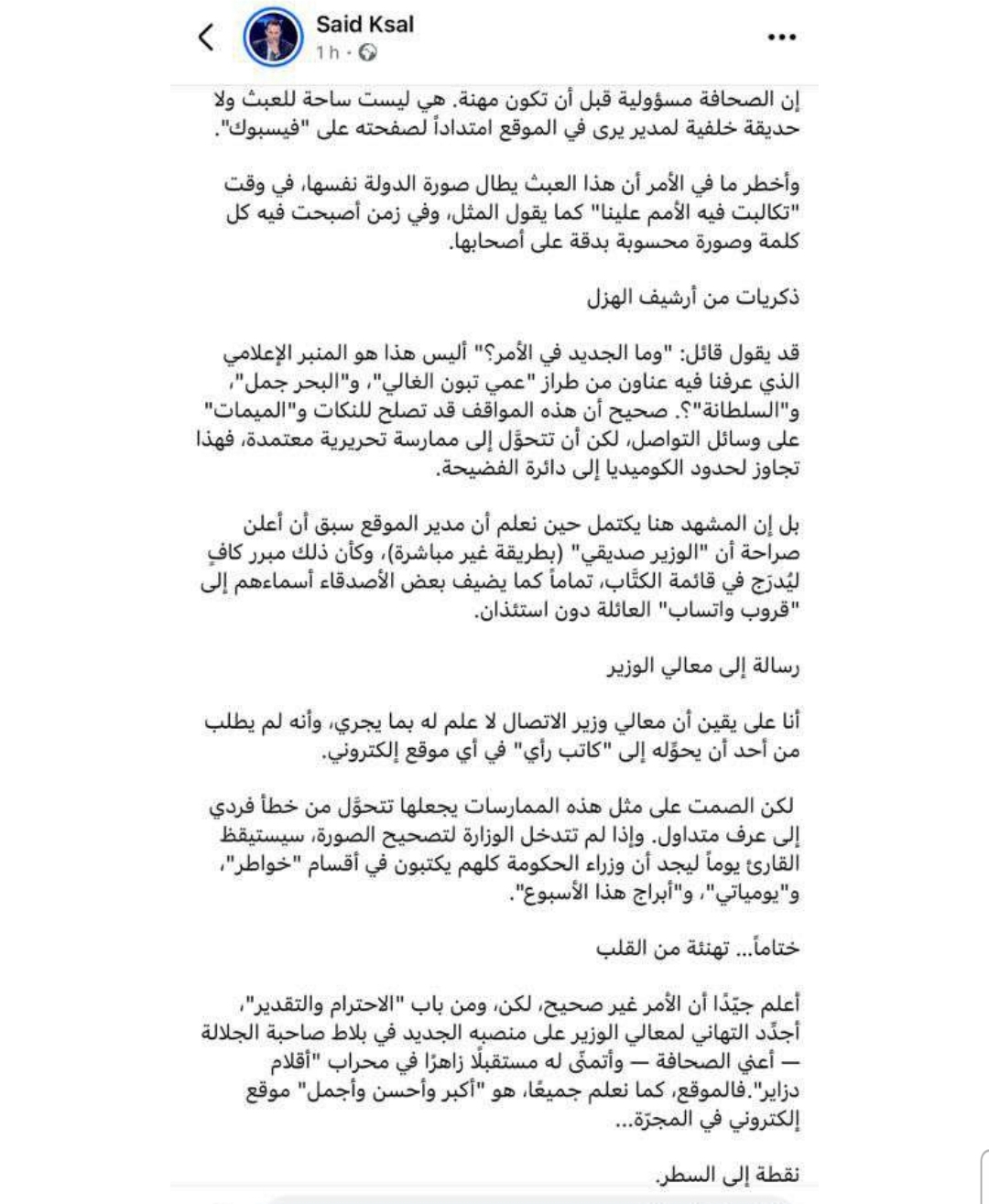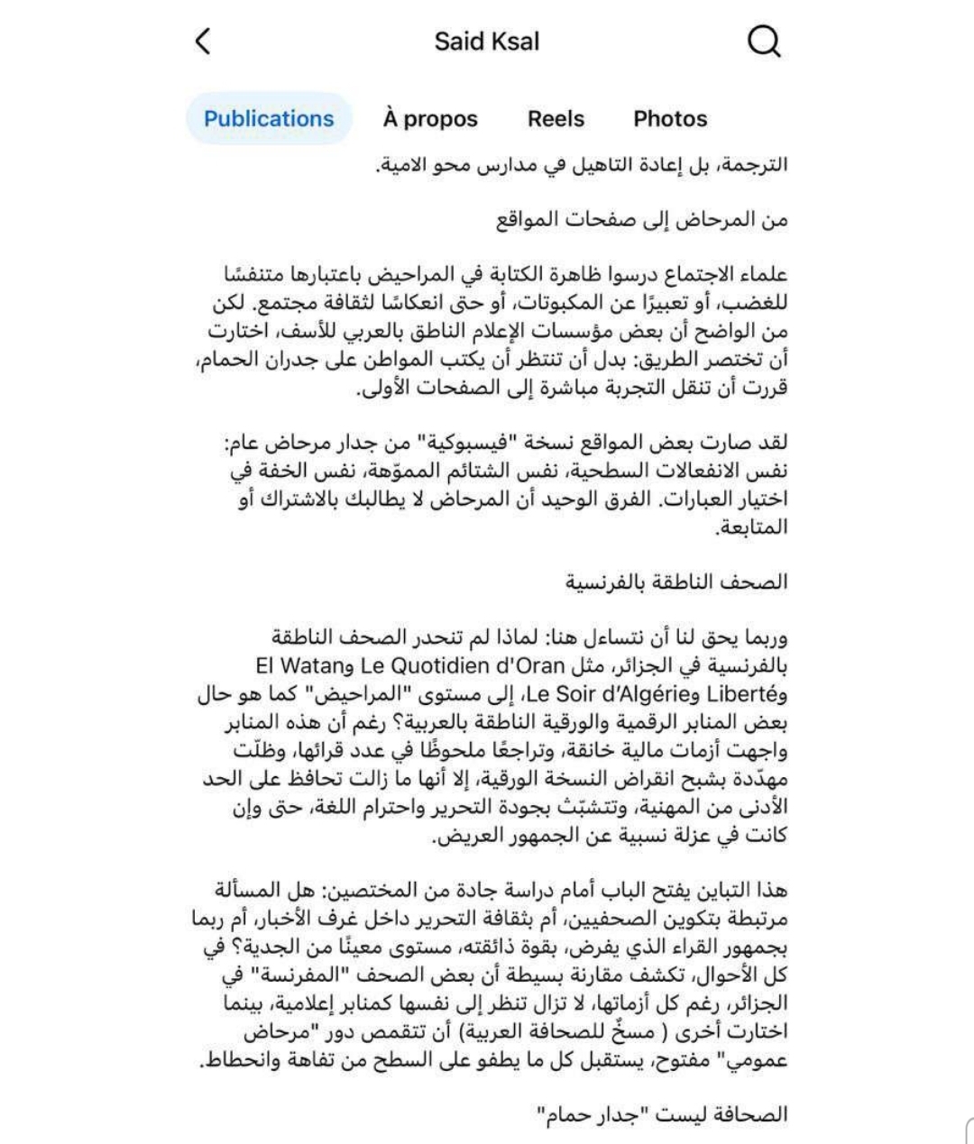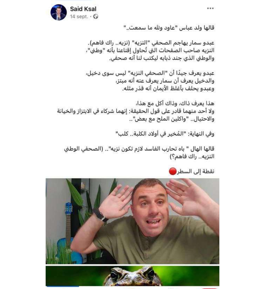 وأشار السيد قاني إلى أن المدعو سعيد كسال يستخدم صفحته على الفيسبوك كمنصة للتهجم المتكرر بغرض الإساءة إلى شخصيات وطنية وإعلامية، في تجاوز واضح لكل القيم والأعراف المهنية، مؤكدًا أن الصور المرفقة التي تمثل لقطات شاشة من حسابه الرسمي على “فيسبوك” تُظهر بوضوح طبيعة العبارات المهينة والتحريضية التي ينشرها ضدّه وضدّ مؤسسته الإعلامية وأيضاً تلك الشخصيات الوطنية والإعلامية.