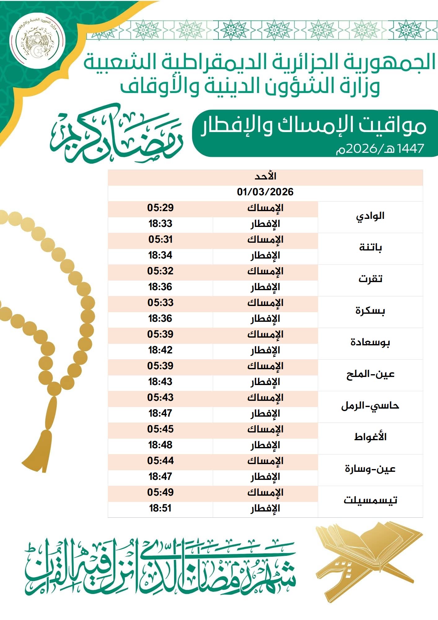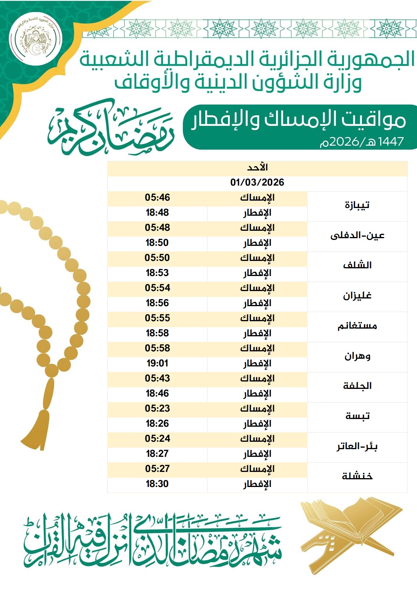 وفيما يلي مواقيت الإمساك والإفطار ليوم 11 رمضان 1447هـ / 01 مارس 2026: