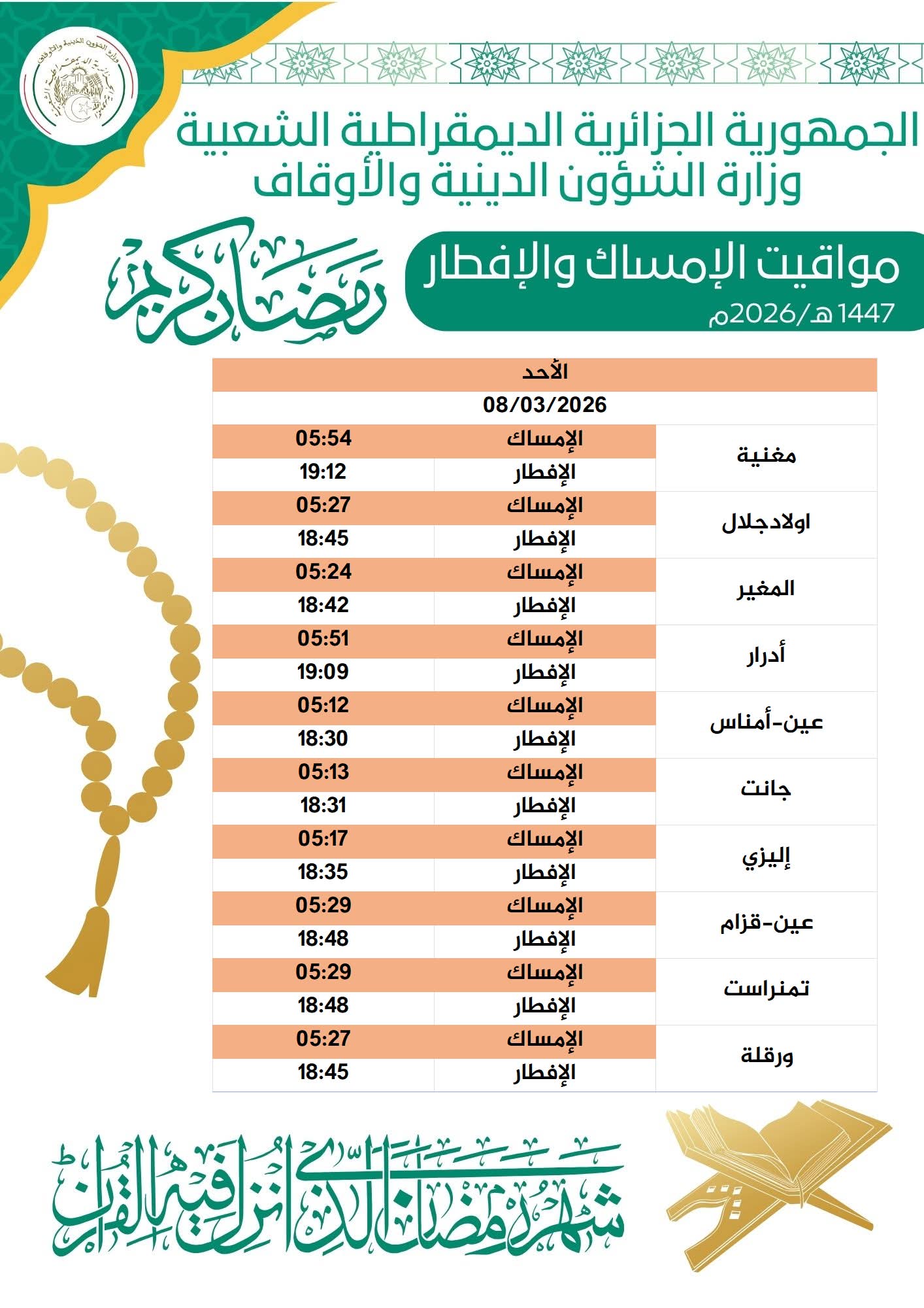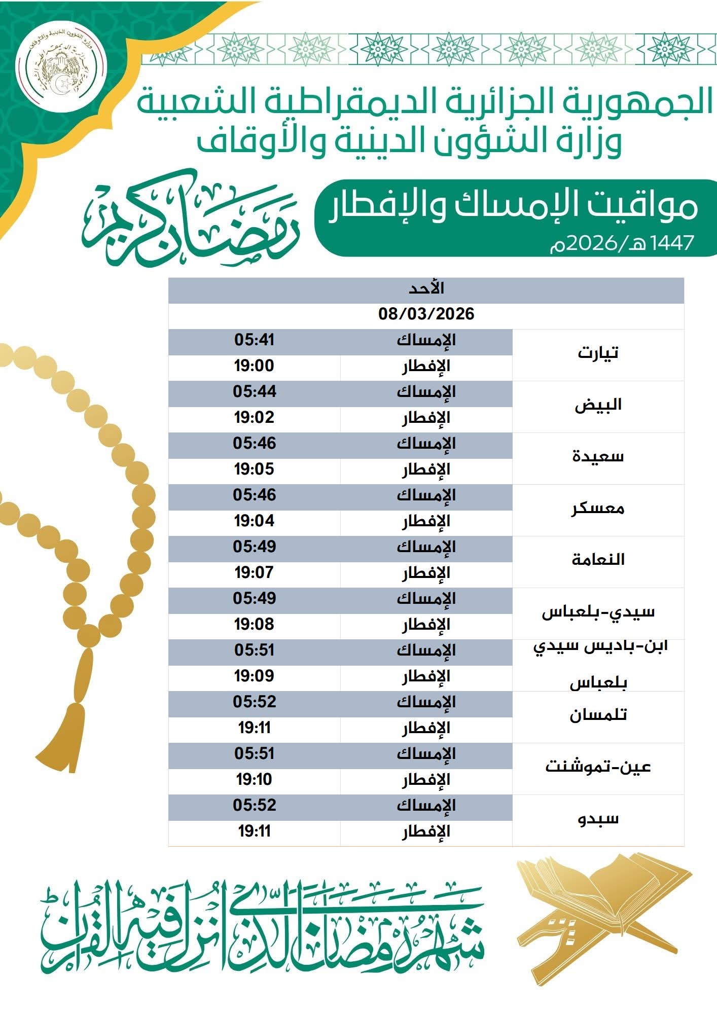 وفيما يلي مواقيت الإمساك والإفطار ليوم 18 رمضان 1447هـ / 08 مارس 2026: