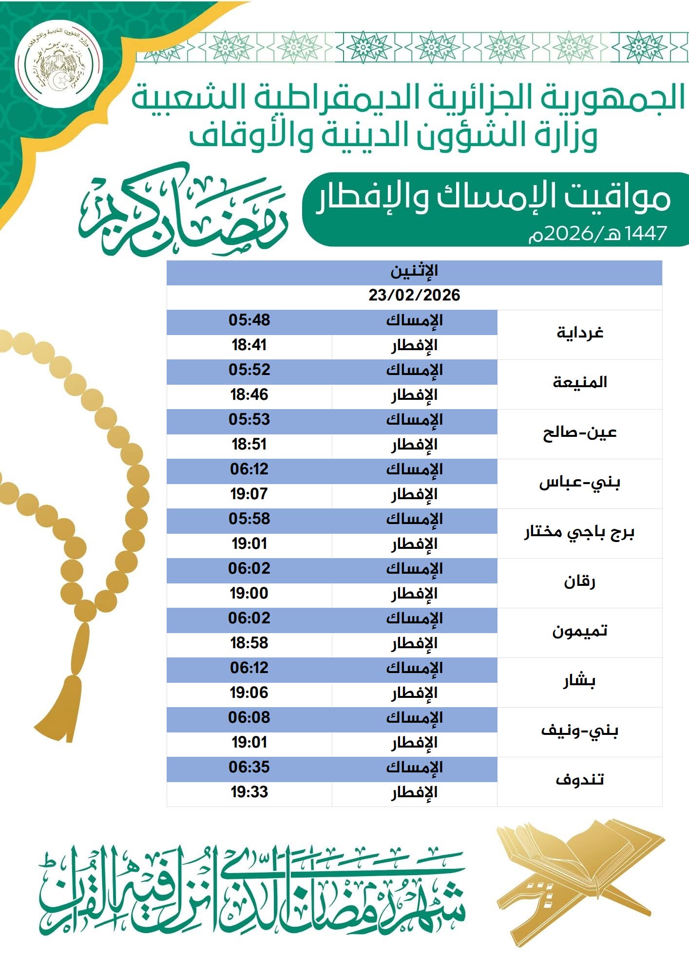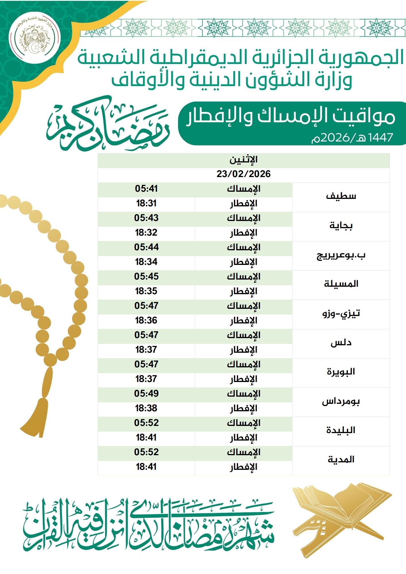 وفيما يلي مواقيت الإمساك والإفطار ليوم 05 رمضان 1447هـ / 23 فيفري 2026:
