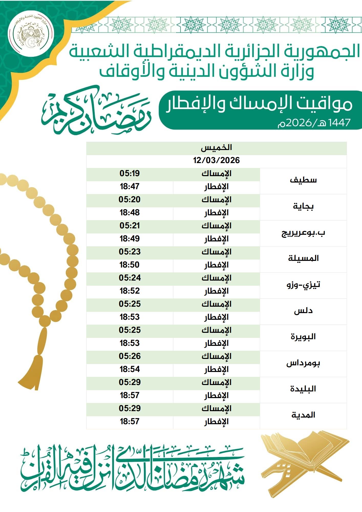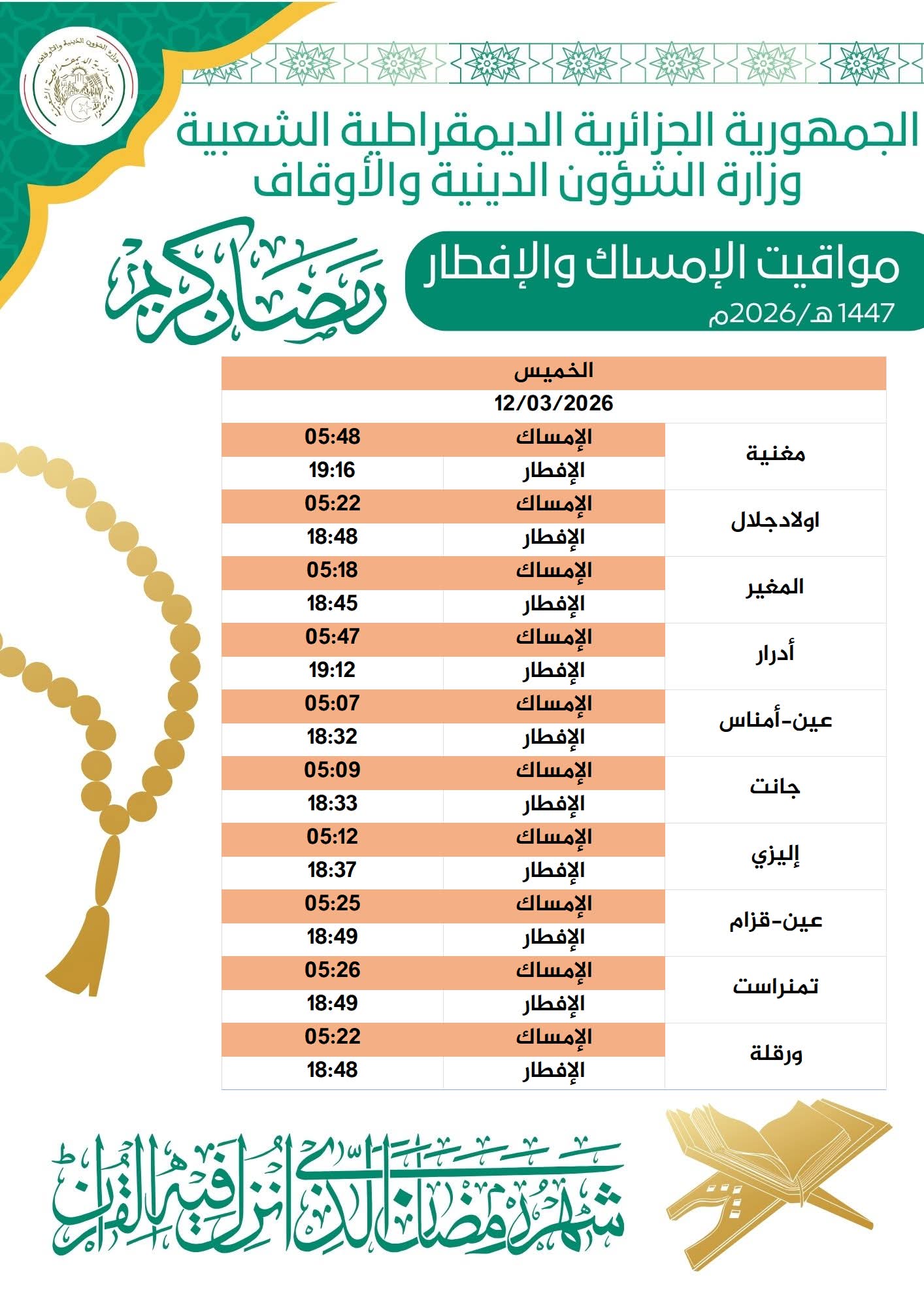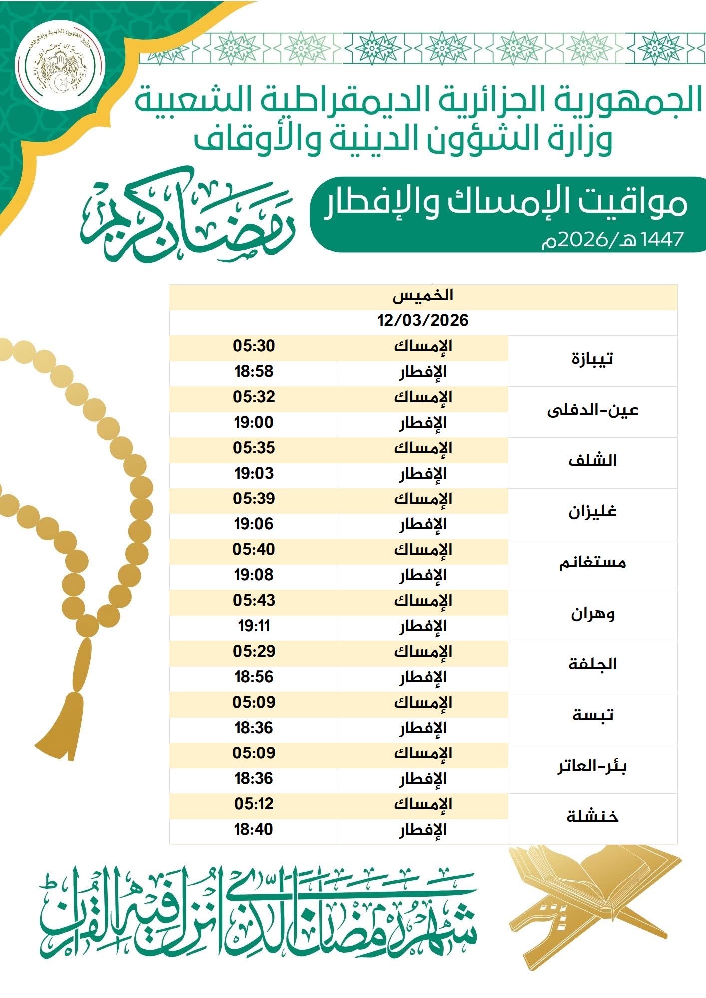 وفيما يلي مواقيت الإمساك والإفطار ليوم 22 رمضان 1447هـ / 11 مارس 2026: