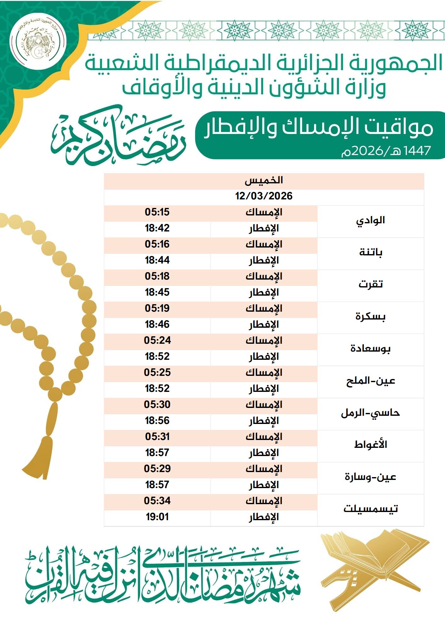 كشفت وزارة الشؤون الدينية والأوقاف عن مواقيت الإمساك والإفطار في شهر رمضان، الخاصة بيوم غد الخميس، لجميع أنحاء الوطن.