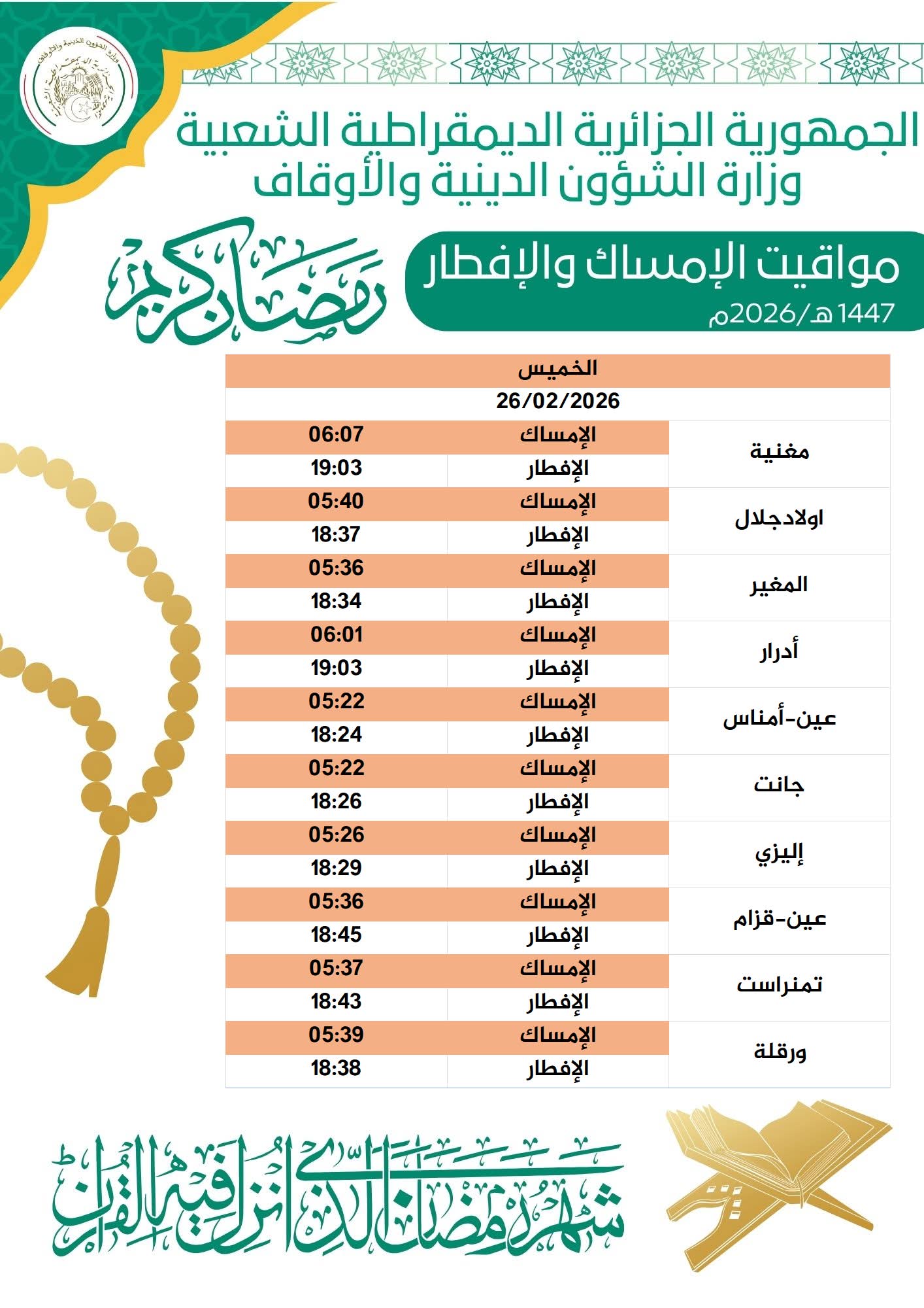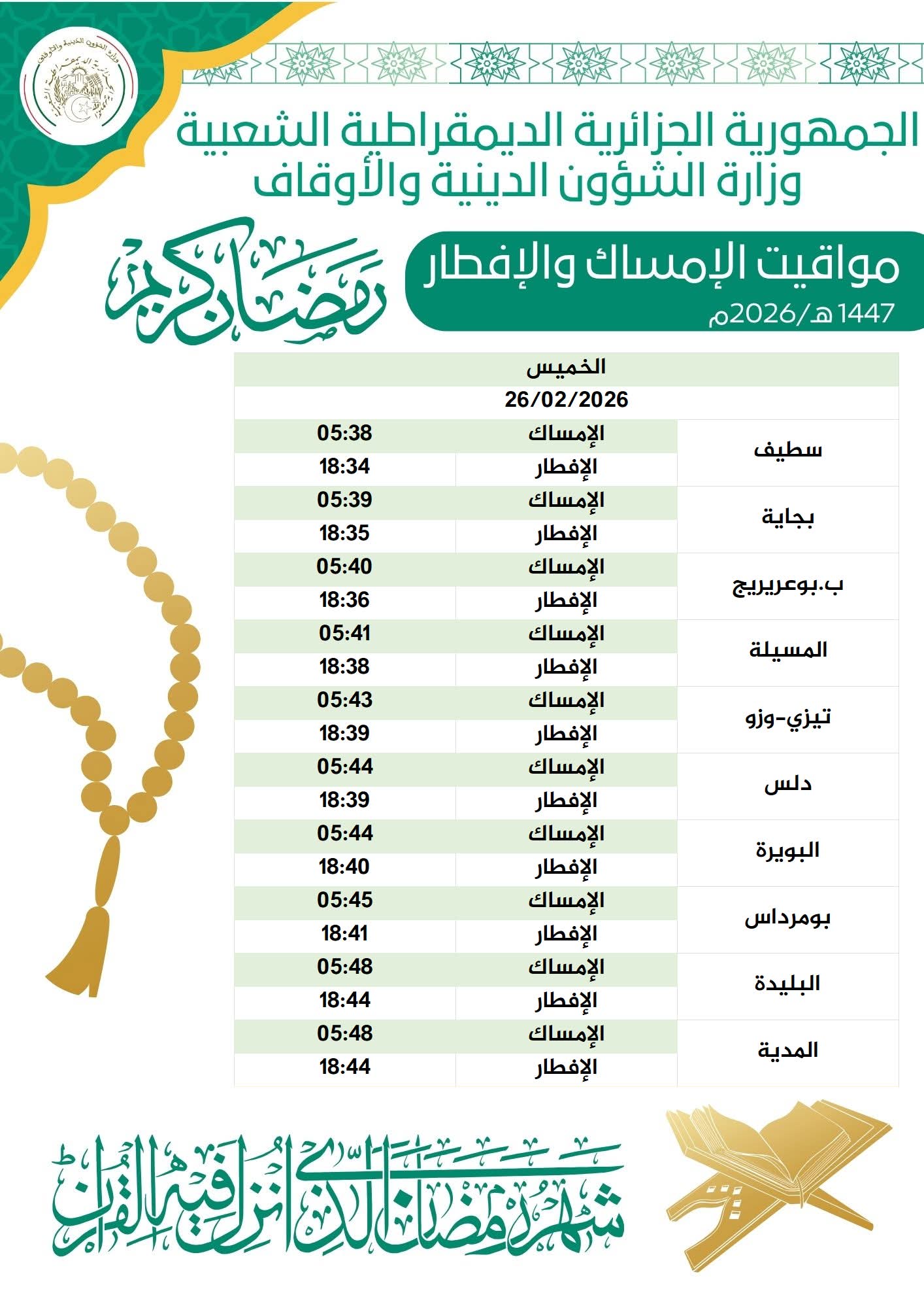 وفيما يلي مواقيت الإمساك والإفطار ليوم 08 رمضان 1447هـ / 26 فيفري 2026: