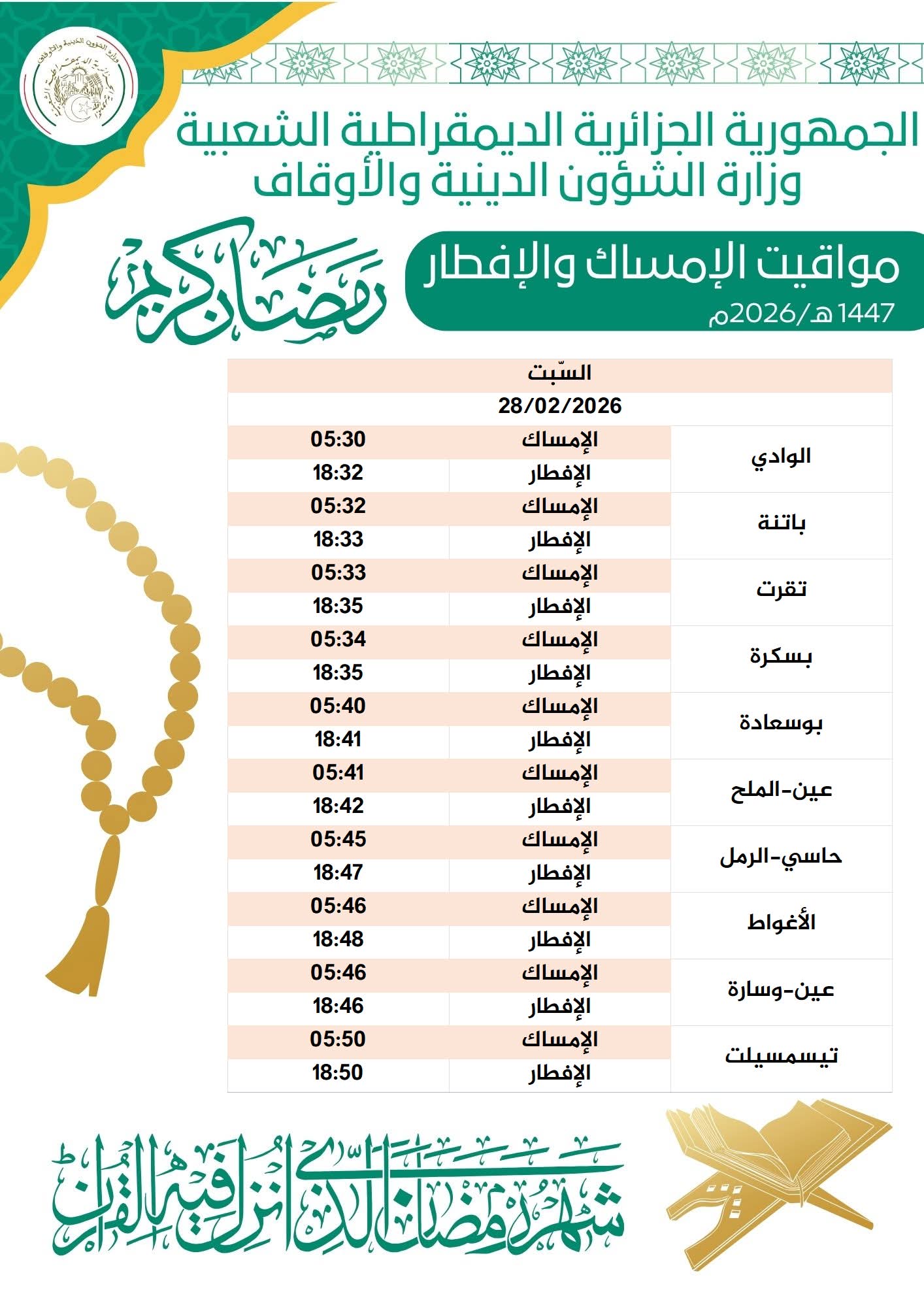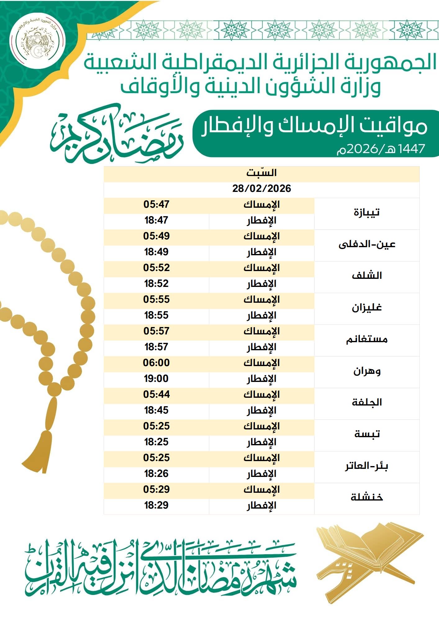 وفيما يلي مواقيت الإمساك والإفطار ليوم 10 رمضان 1447هـ / 28 فيفري 2026: