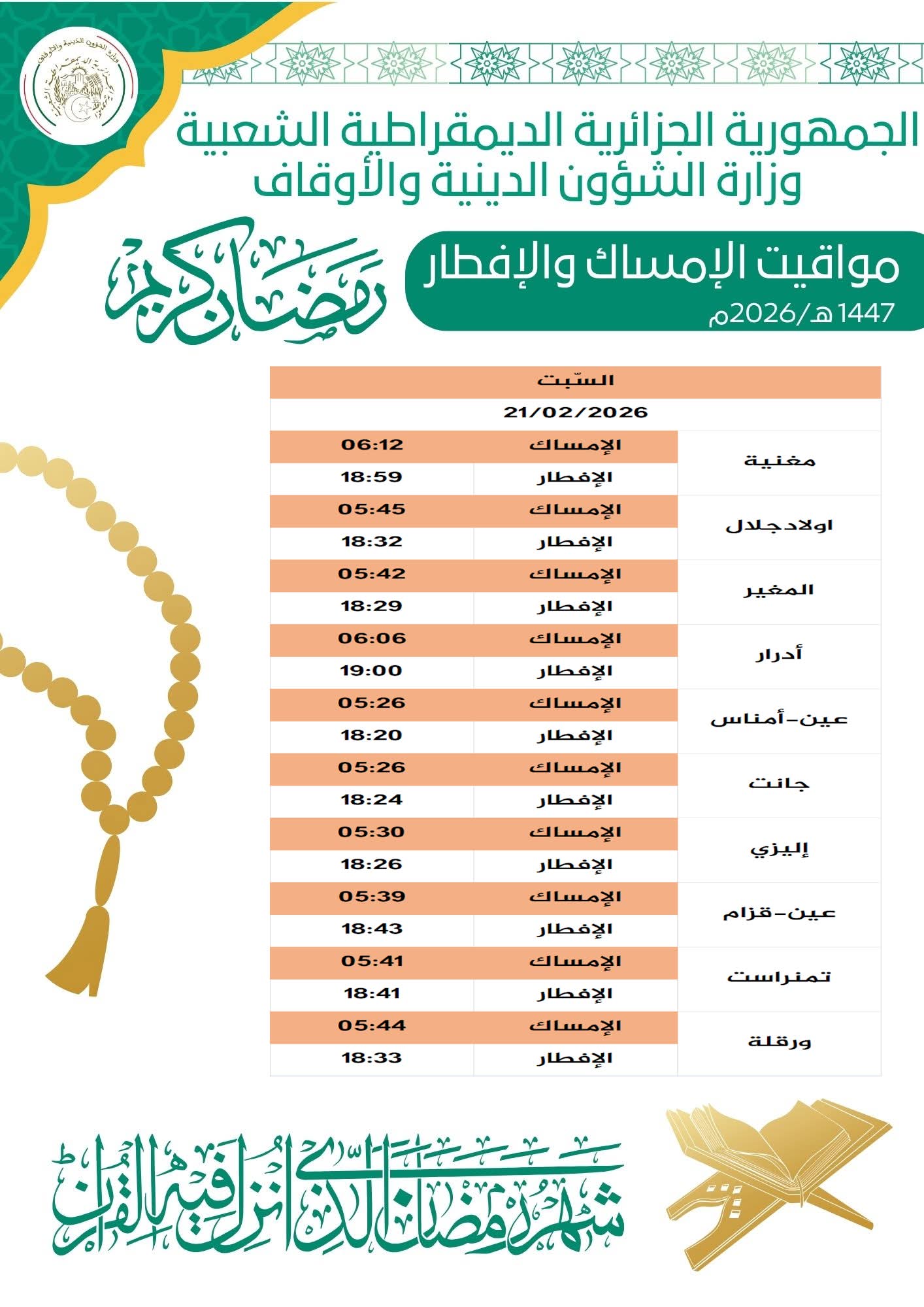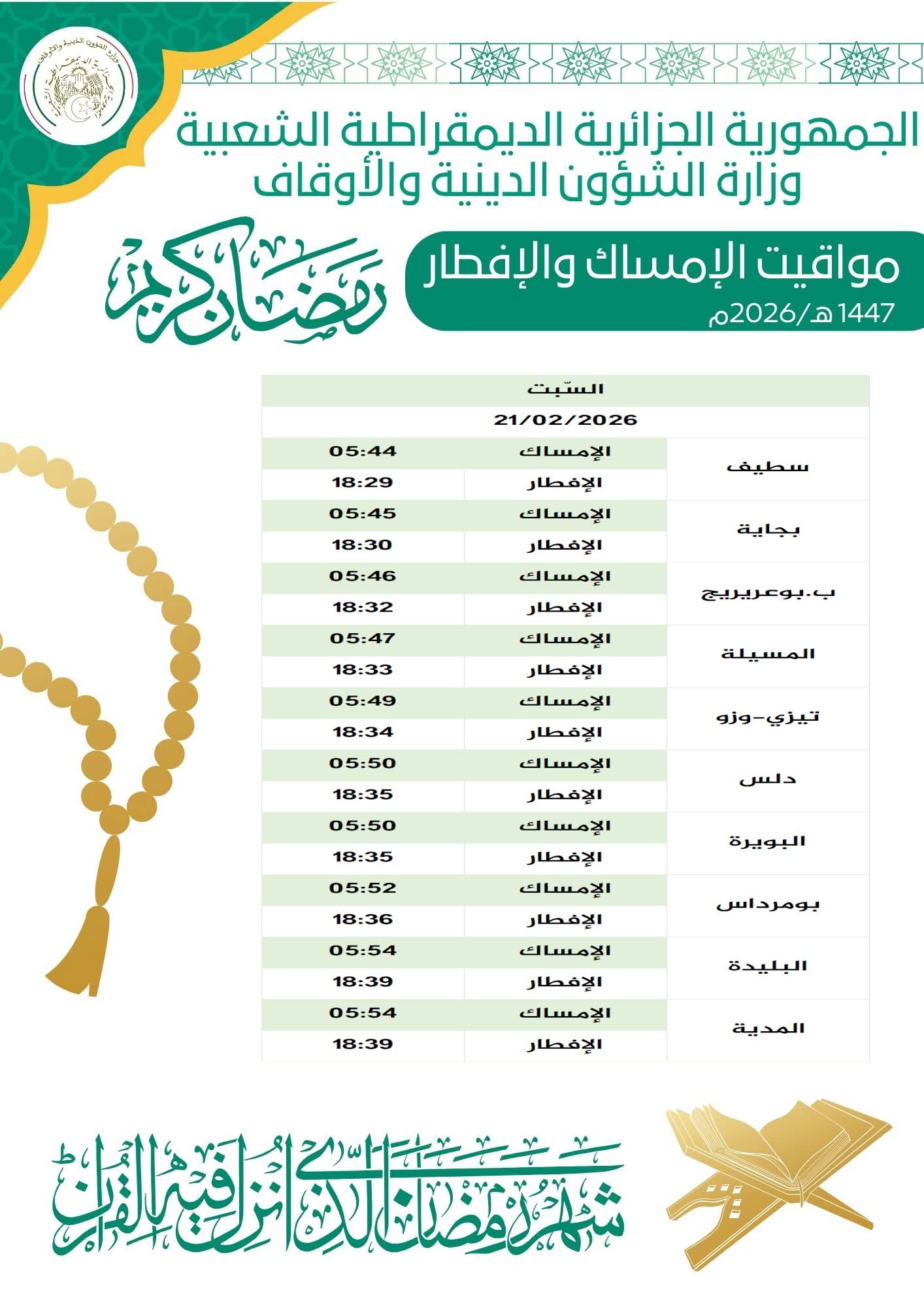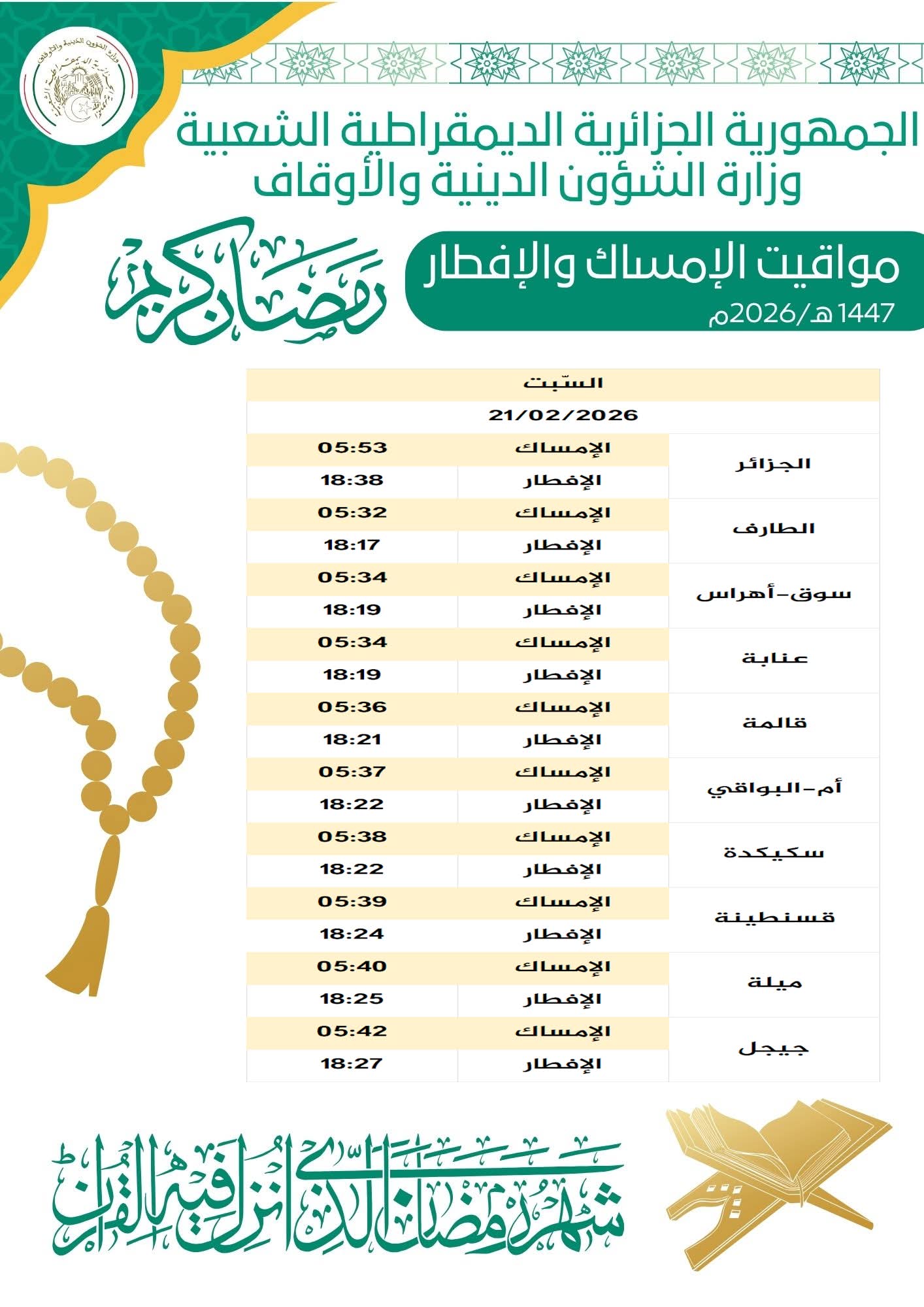 وفيما يلي مواقيت الإمساك والإفطار ليوم 03 رمضان 1447هـ / 21 فيفري 2026:
