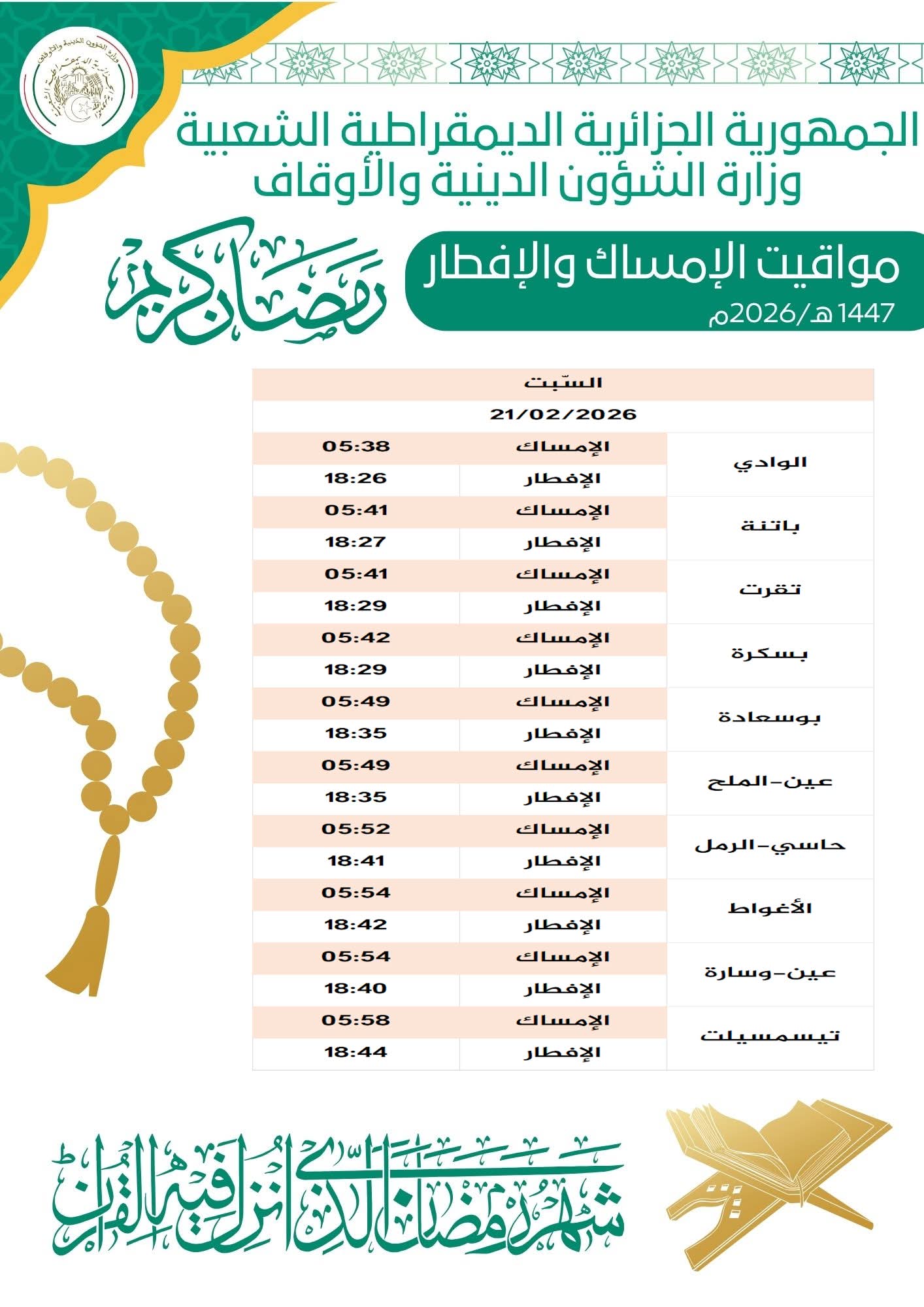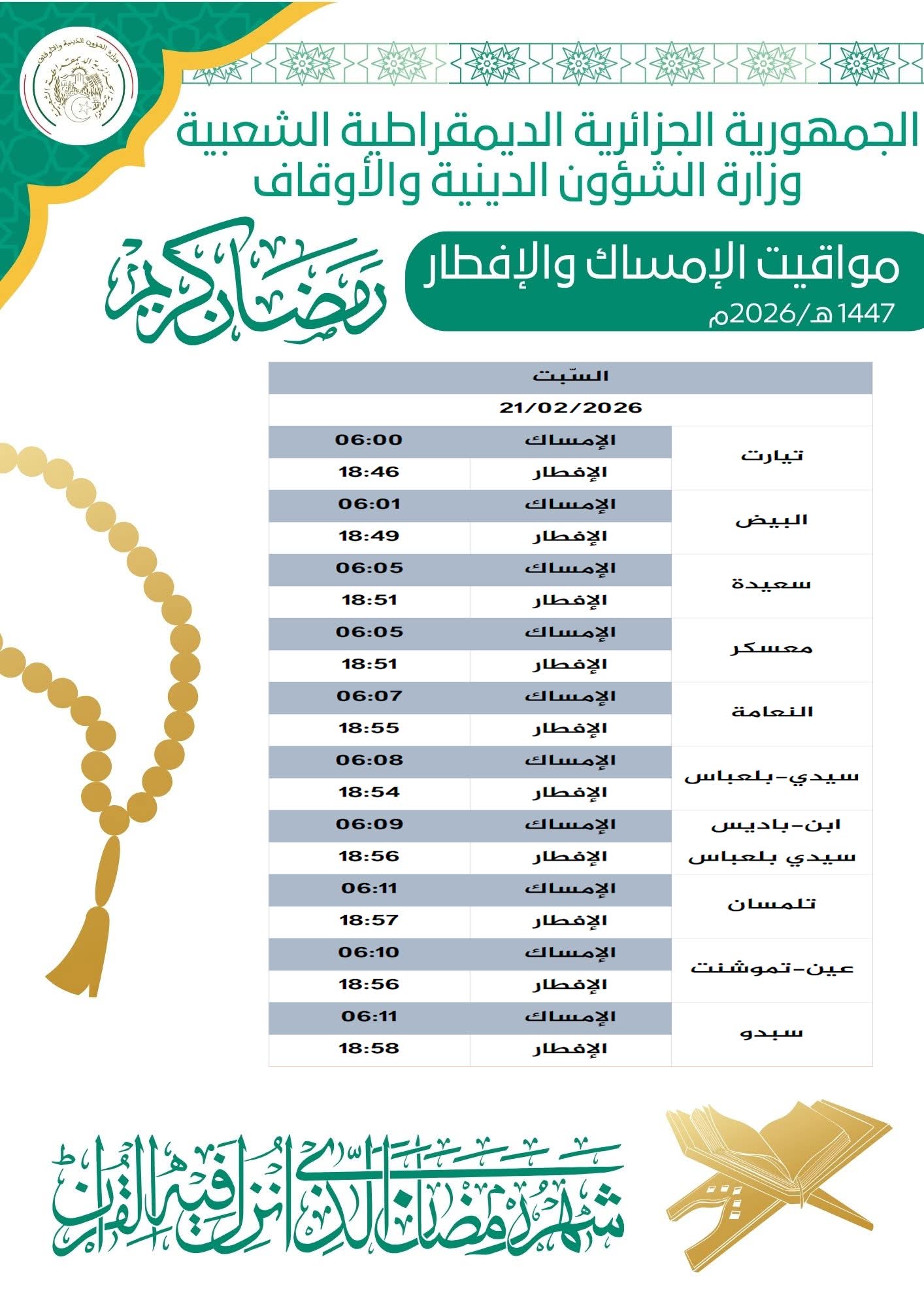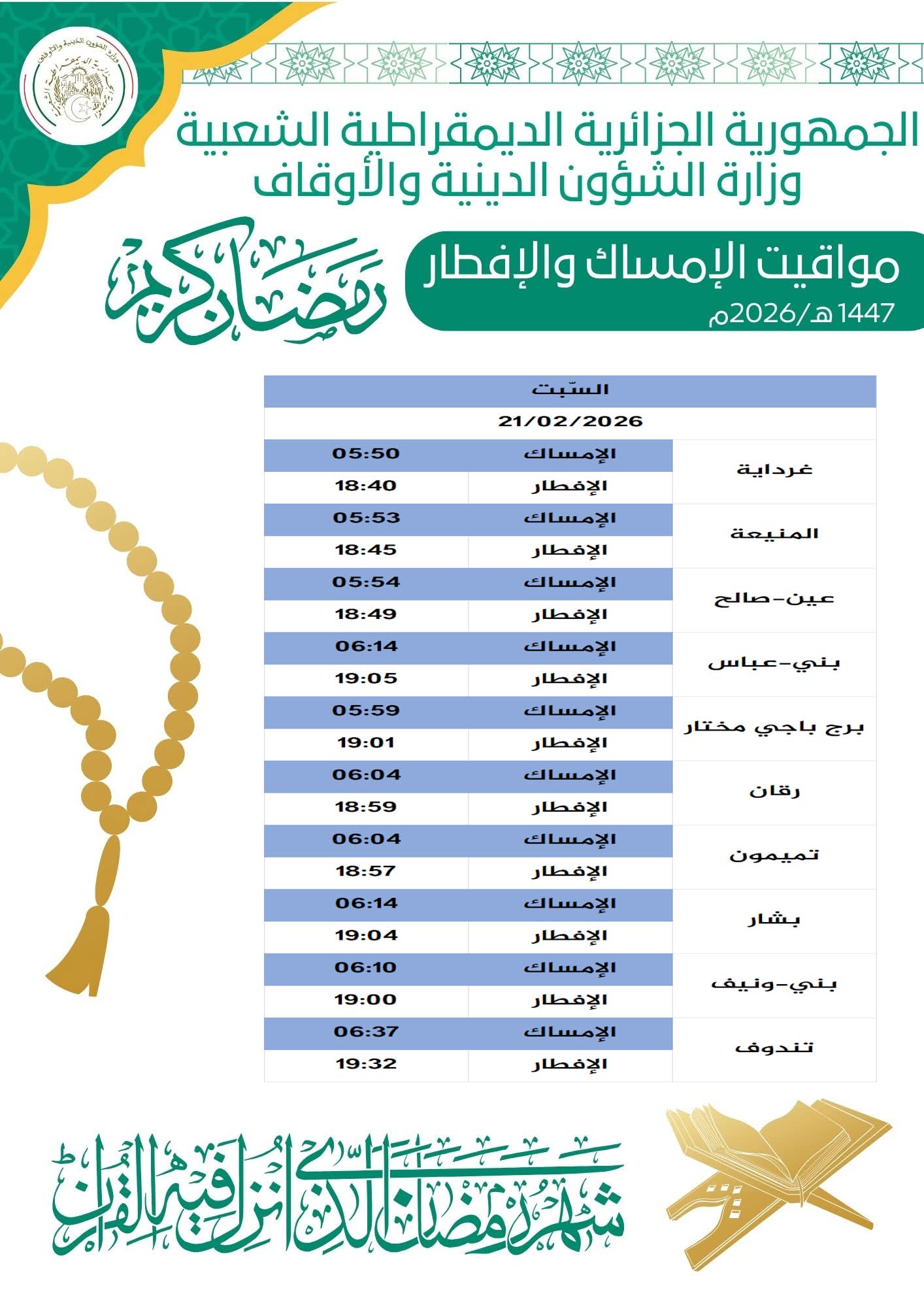 وفيما يلي مواقيت الإمساك والإفطار ليوم 03 رمضان 1447هـ / 21 فيفري 2026: