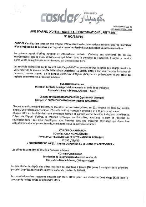 الموضوع: توريد كابينة (غرفة) طلاء/تجفيف وملحقاتها موجهة لمشاريع كوسيدار قنوات.