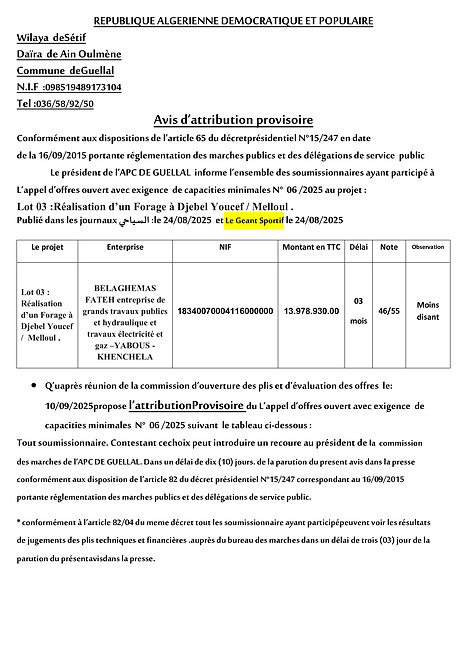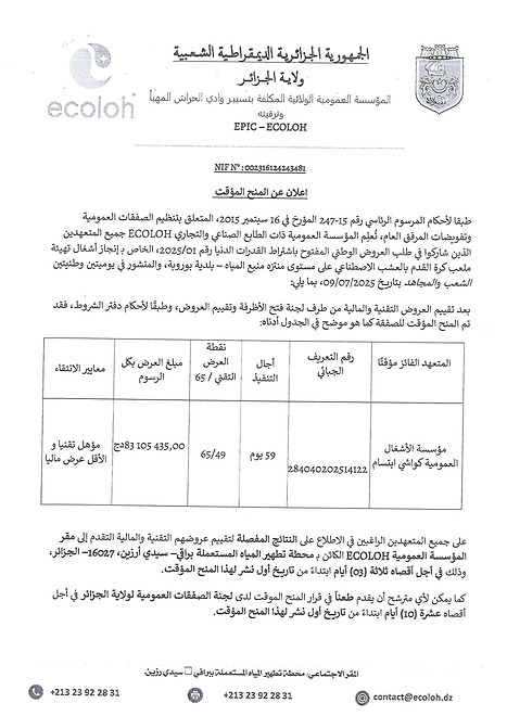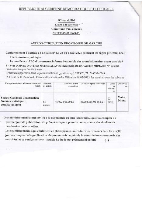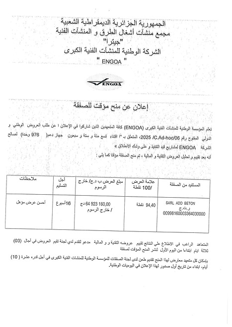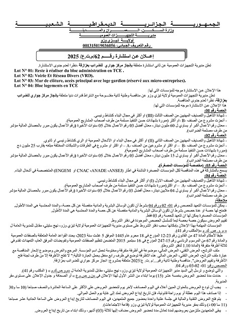 الموضوع: إنجاز أشغال متبقية بمنطقة بالهضاب بمنحدر جوراي، وتتضمن أربع حصص (المبنى الإداري، الطرقات والشبكات المختلفة، جدار السور والمدخل الرئيسي، ومبنى السكنات)