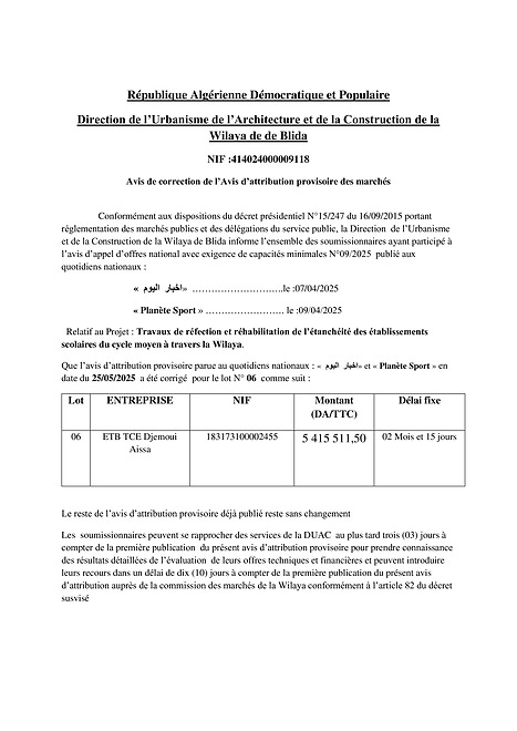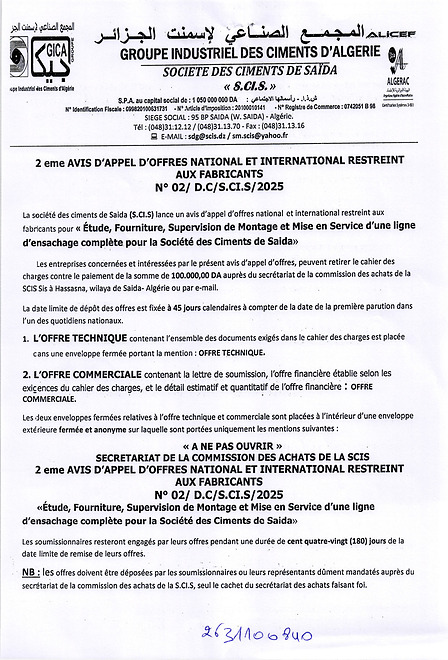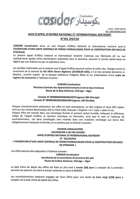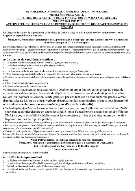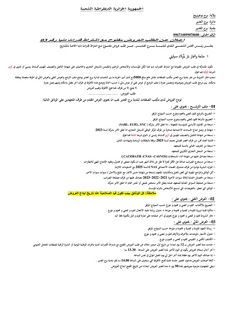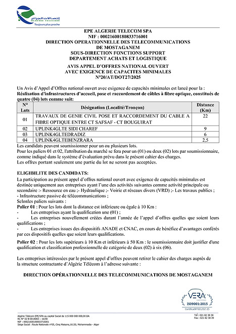 النوع: الإعلان الثاني عن طلب عروض وطني مفتوح مع اشتراط قدرات دنيا.