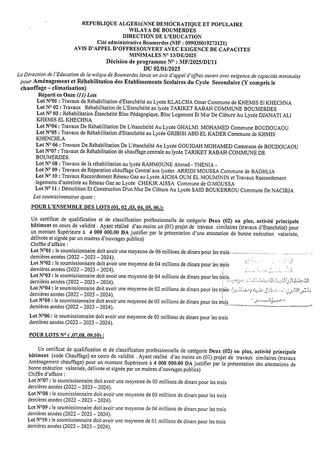 الموضوع: تهيئة وإعادة تأهيل مؤسسات مدرسية للطور الثانوي (بما في ذلك التدفئة والتكييف)، مقسمة إلى إحدى عشرة (11) حصة.