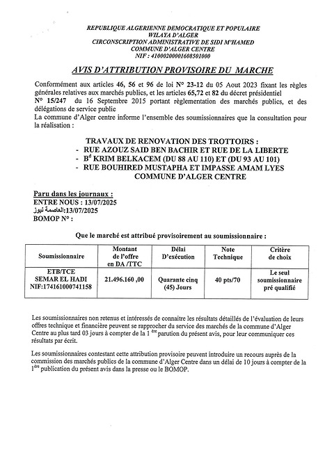 الموضوع: أشغال تجديد أرصفة شوارع (شارع عزوز سعيد بن بشير، شارع الحرية، شارع كريم بلقاسم، شارع بوحيرد مصطفى، وممر أمام إلياس)