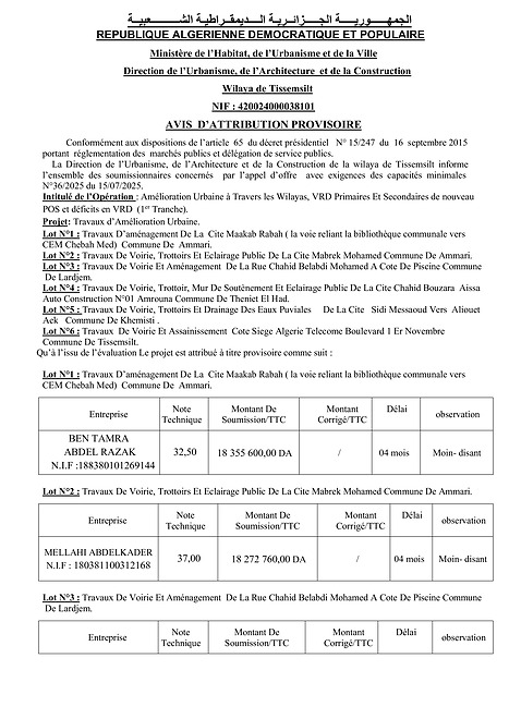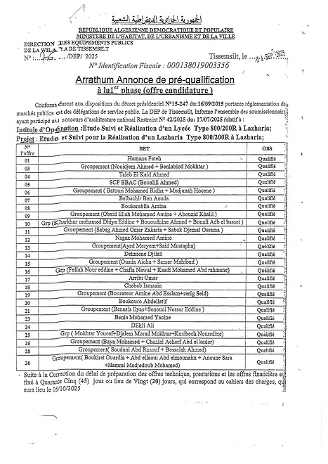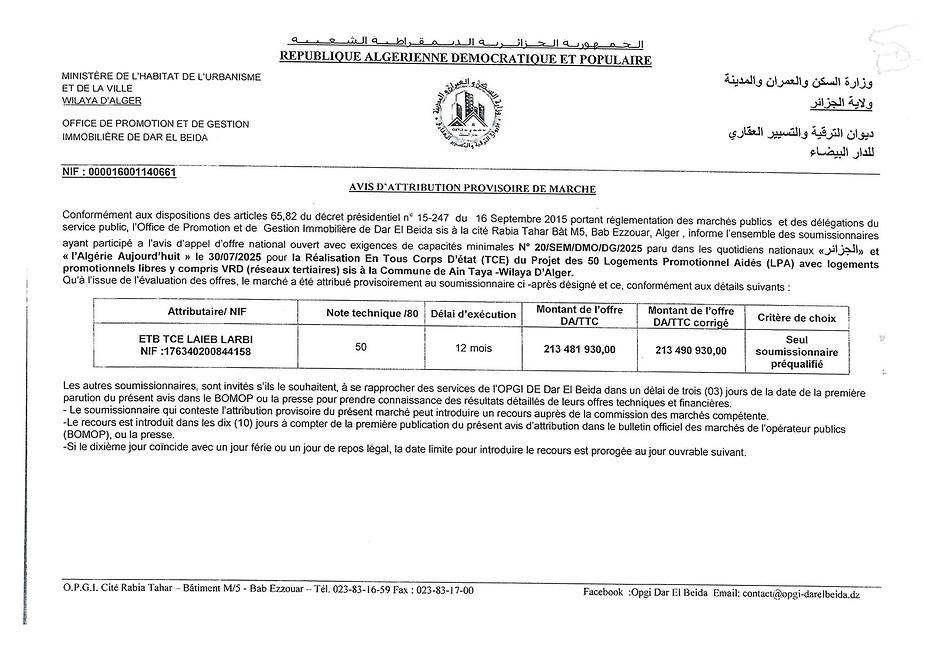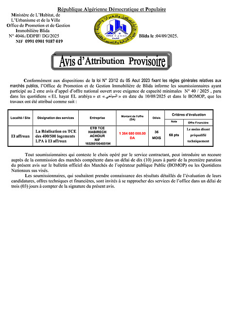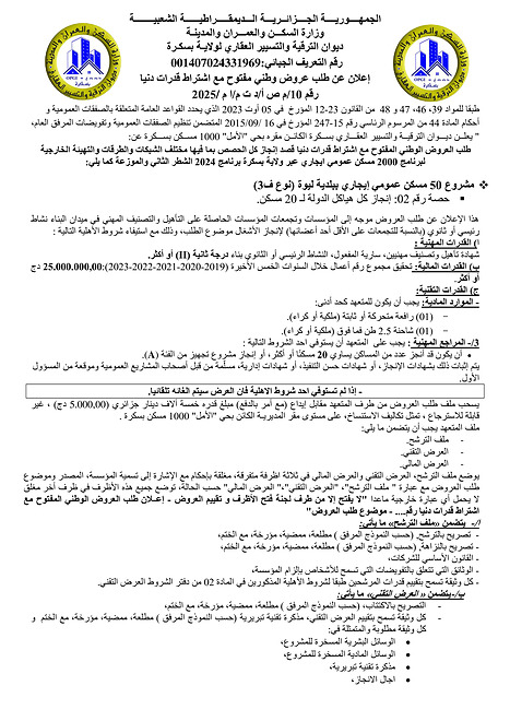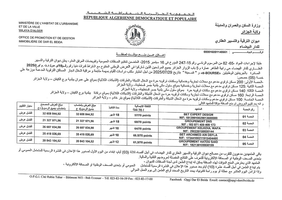 الموضوع: دراسة ومتابعة ومراقبة وإنجاز أشغال السكن الترقوي المدعم (موزعة على خمس حصص في برج الكيفان، بلدية سيدي موسى، وعين بنيان)