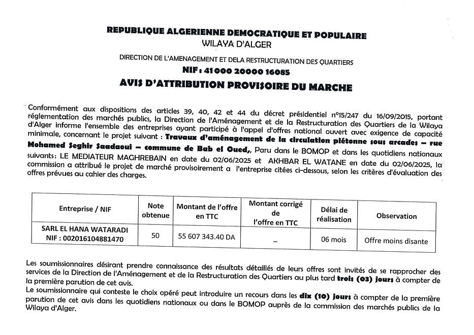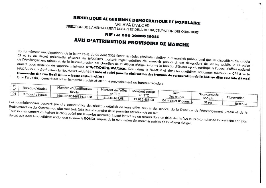 العميل: مديرية التهيئة وإعادة هيكلة الأحياء لولاية الجزائر