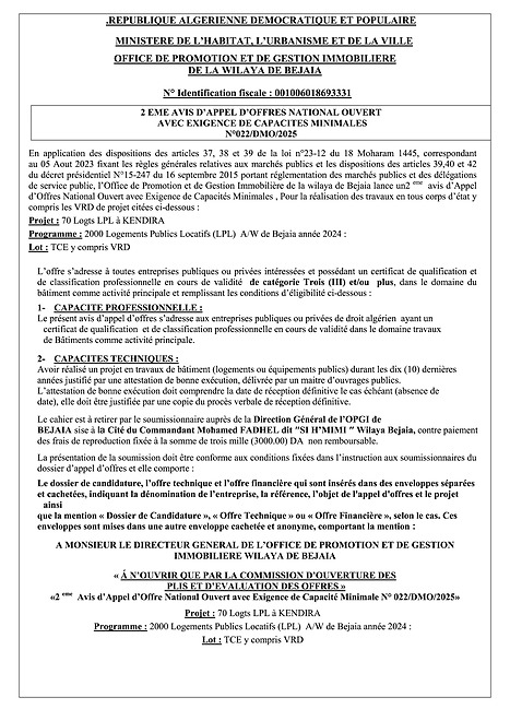 الموضوع: إنجاز 70 مسكن عمومي إيجاري (LPL) في كنديرة (جميع مهن البناء بما في ذلك الطرق والشبكات المختلفة)
