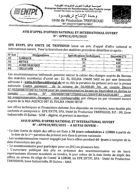 الموضوع: توريد مواد أولية (إلمنيت، روتيل، حمض السيليسيك، سليلوز).