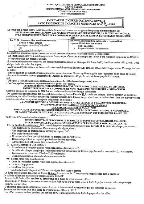 الموضوع: خدمات اكتتاب بوليصات التأمين على الممتلكات، حظيرة السيارات، والمسؤولية المدنية لبلدية الجزائر الوسطى لسنة 2026 (مقسمة إلى حصتين).