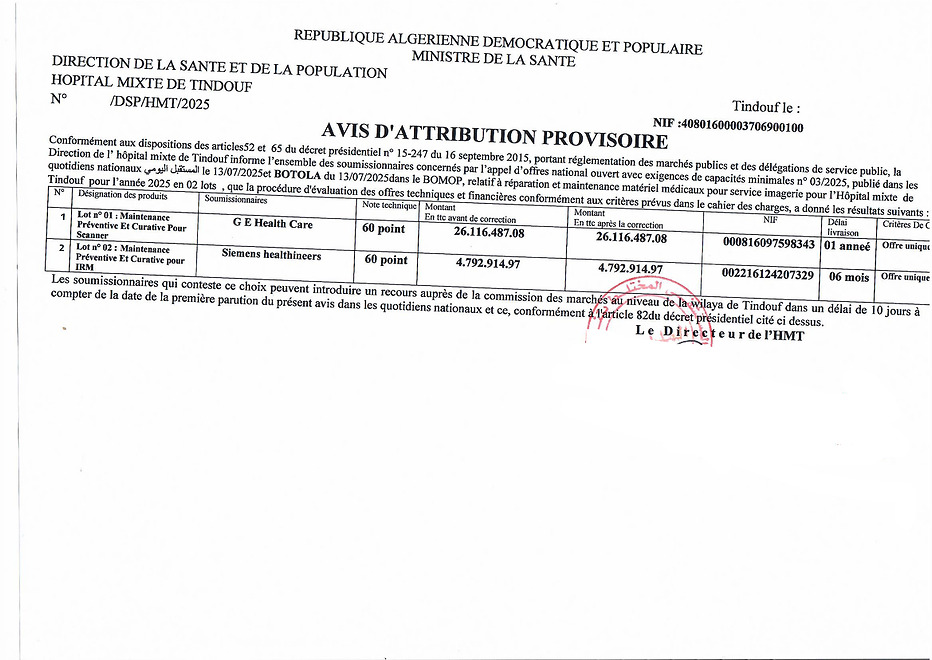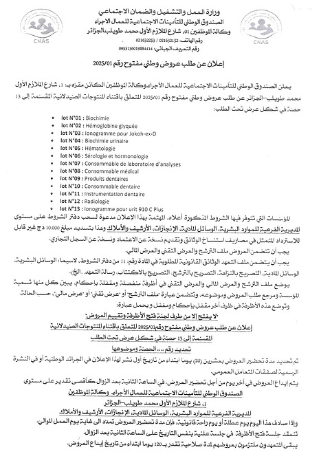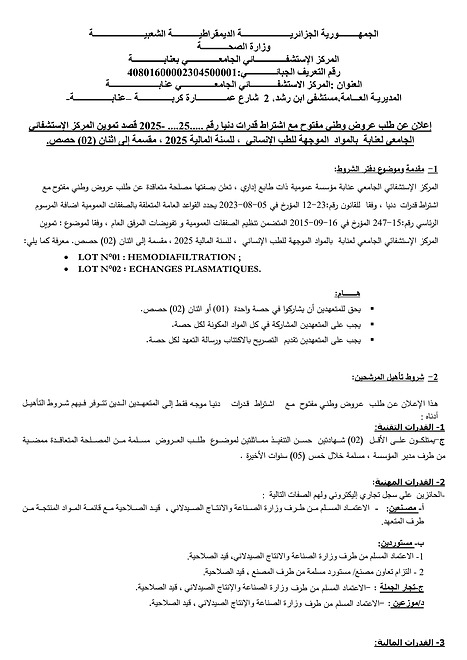 الموضوع: تموين المركز الاستشفائي الجامعي بالمواد الموجهة للطب الإنساني (الحصة 01: الترشيح الدموي، الحصة 02: تبادل البلازما) للسنة المالية 2025.