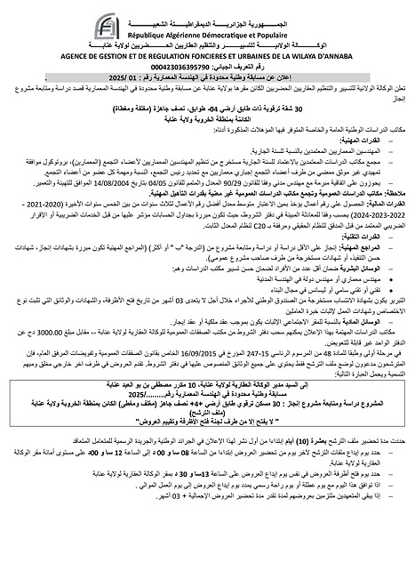 الموضوع: دراسة ومتابعة مشروع إنجاز 30 شقة ترقوية نصف جاهزة (مغلقة ومغطاة) كائنة بمنطقة الخروبة، ولاية عنابة