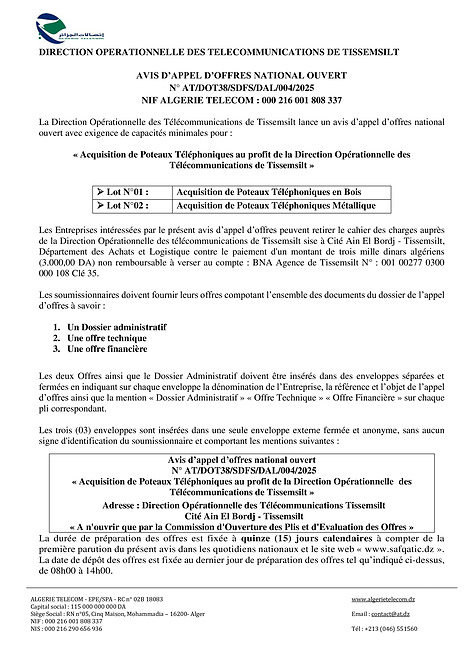العميل: اتصالات الجزائر - المديرية العملية للاتصالات لتسمسيلت