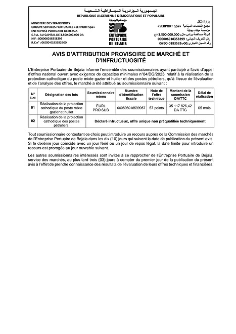 النوع: إعلان عن منح مؤقت للصفقة وعدم جدوى
