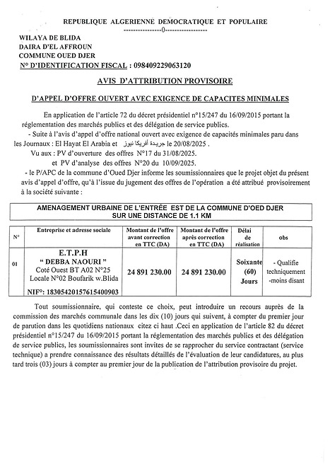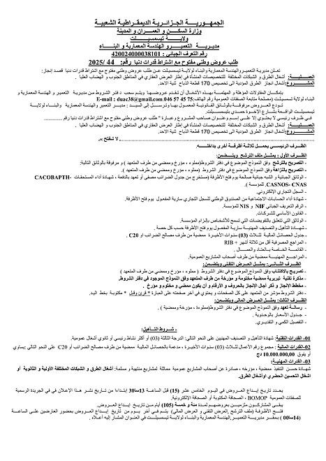 الموضوع: إنجاز 50 مسكن ترقوي مدعم (LPA) مع سكنات ترقوية حرة بما في ذلك الطرق والشبكات المختلفة (TCE/VRD)، ببلدية عين طاية.