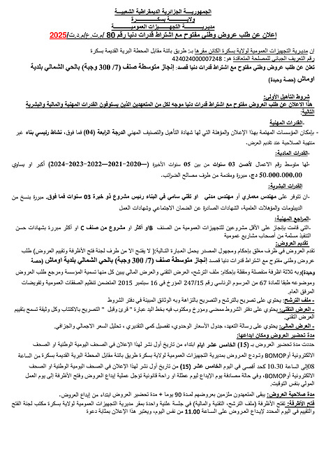 إعلان عن طلب عروض وطني مفتوح مع اشتراط قدرات دنيا