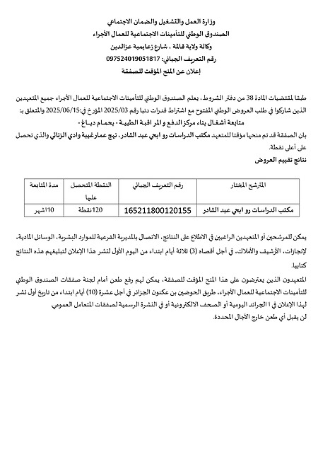 العميل: الصندوق الوطني للتأمينات الاجتماعية للعمال الأجراء - وكالة ولاية قالمة.