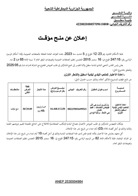 الموضوع: إعادة الاعتبار للملعب البلدي لبلدية أسطيل (الشطر الأول)